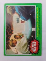 1977 Topps Star Wars Series 4 Trading Card #202 Green Border – Inquiring about Obi-Wan Kenobi. The Series 4 set was based on Star Wars: Episode IV A New Hope, and featured stills from the film, promotional photos and behind the scenes photos, all within a green border. Backs of the cards featured “Official Description” or “Movie Facts” themes, or included a portion of a larger image that could be pieced together with other cards like a puzzle.