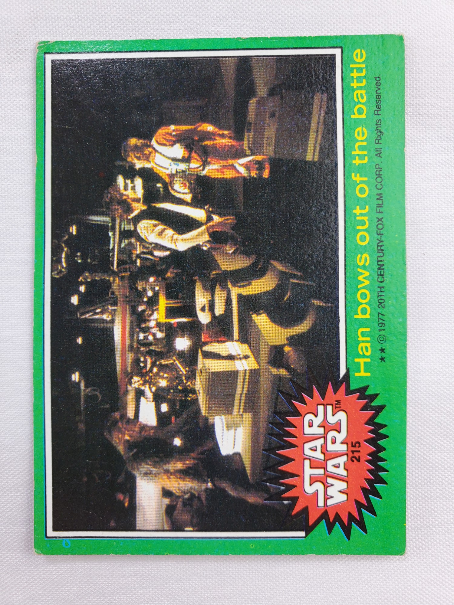 1977 Topps Star Wars Series 4 Trading Card #215 Green Border – Han bows out of the battle. The Series 4 set was based on Star Wars: Episode IV A New Hope, and featured stills from the film, promotional photos and behind the scenes photos, all within a green border. Backs of the cards featured “Official Description” or “Movie Facts” themes, or included a portion of a larger image that could be pieced together with other cards like a puzzle.