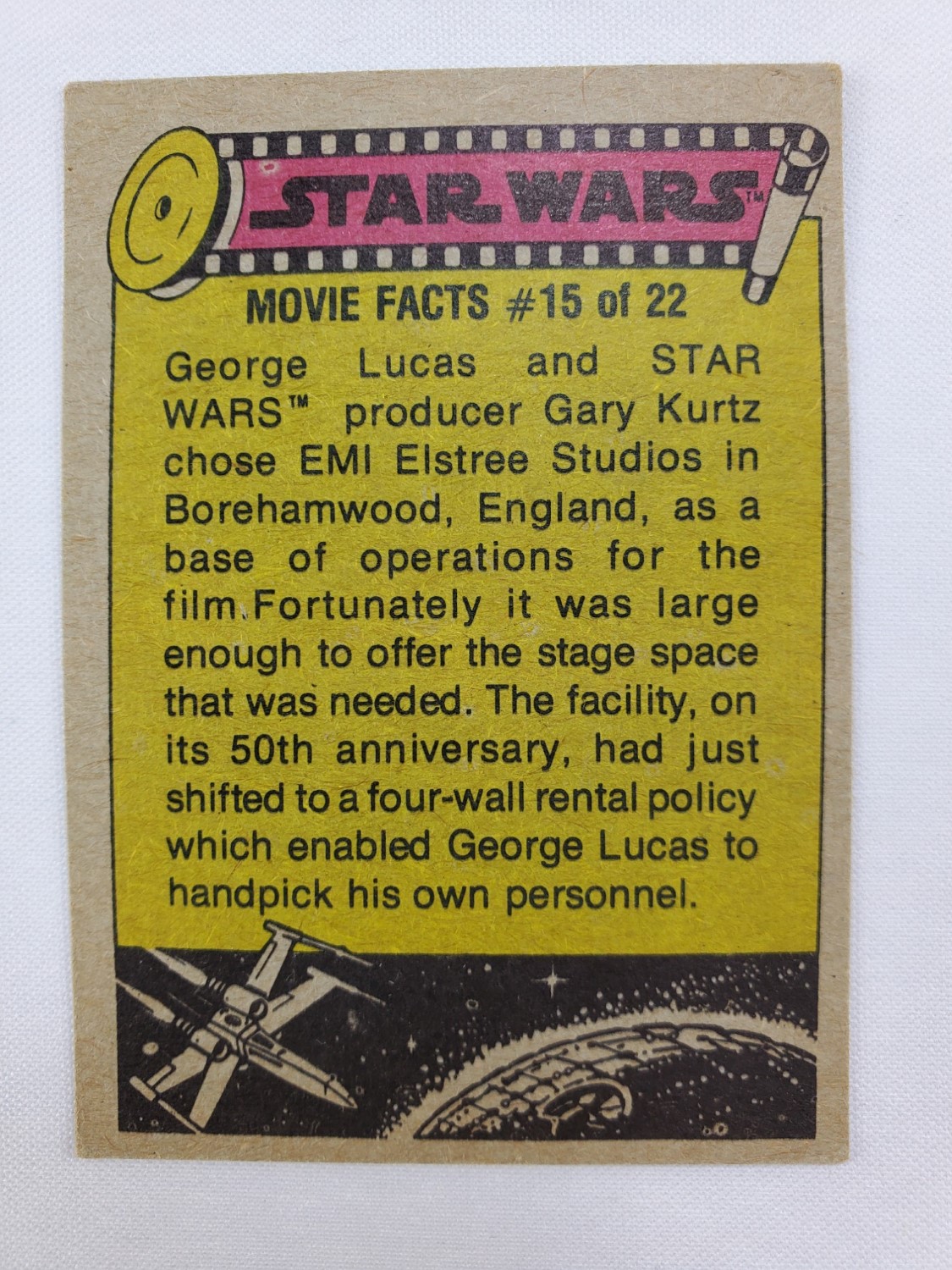 1977 Topps Star Wars Series 4 Trading Card #230 Green Border – Guarding the Millennium Falcon. The Series 4 set was based on Star Wars: Episode IV A New Hope, and featured stills from the film, promotional photos and behind the scenes photos, all within a green border. Backs of the cards featured “Official Description” or “Movie Facts” themes, or included a portion of a larger image that could be pieced together with other cards like a puzzle.