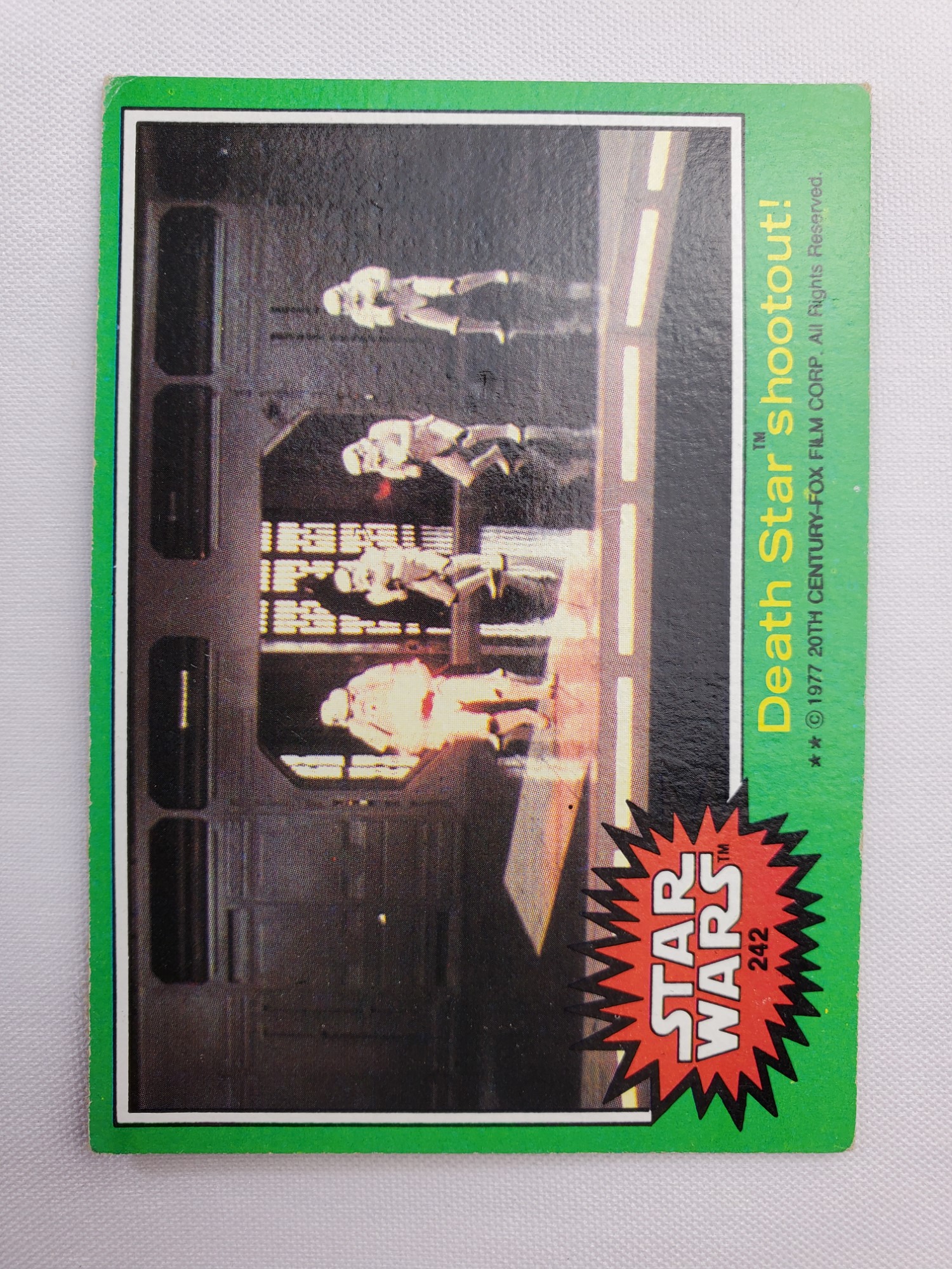 1977 Topps Star Wars Series 4 Trading Card #242 Green Border – Death Star shootout! The Series 4 set was based on Star Wars: Episode IV A New Hope, and featured stills from the film, promotional photos and behind the scenes photos, all within a green border. Backs of the cards featured “Official Description” or “Movie Facts” themes, or included a portion of a larger image that could be pieced together with other cards like a puzzle.