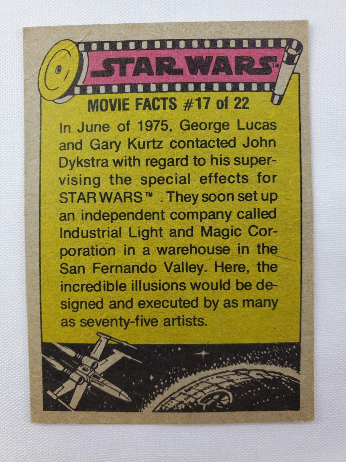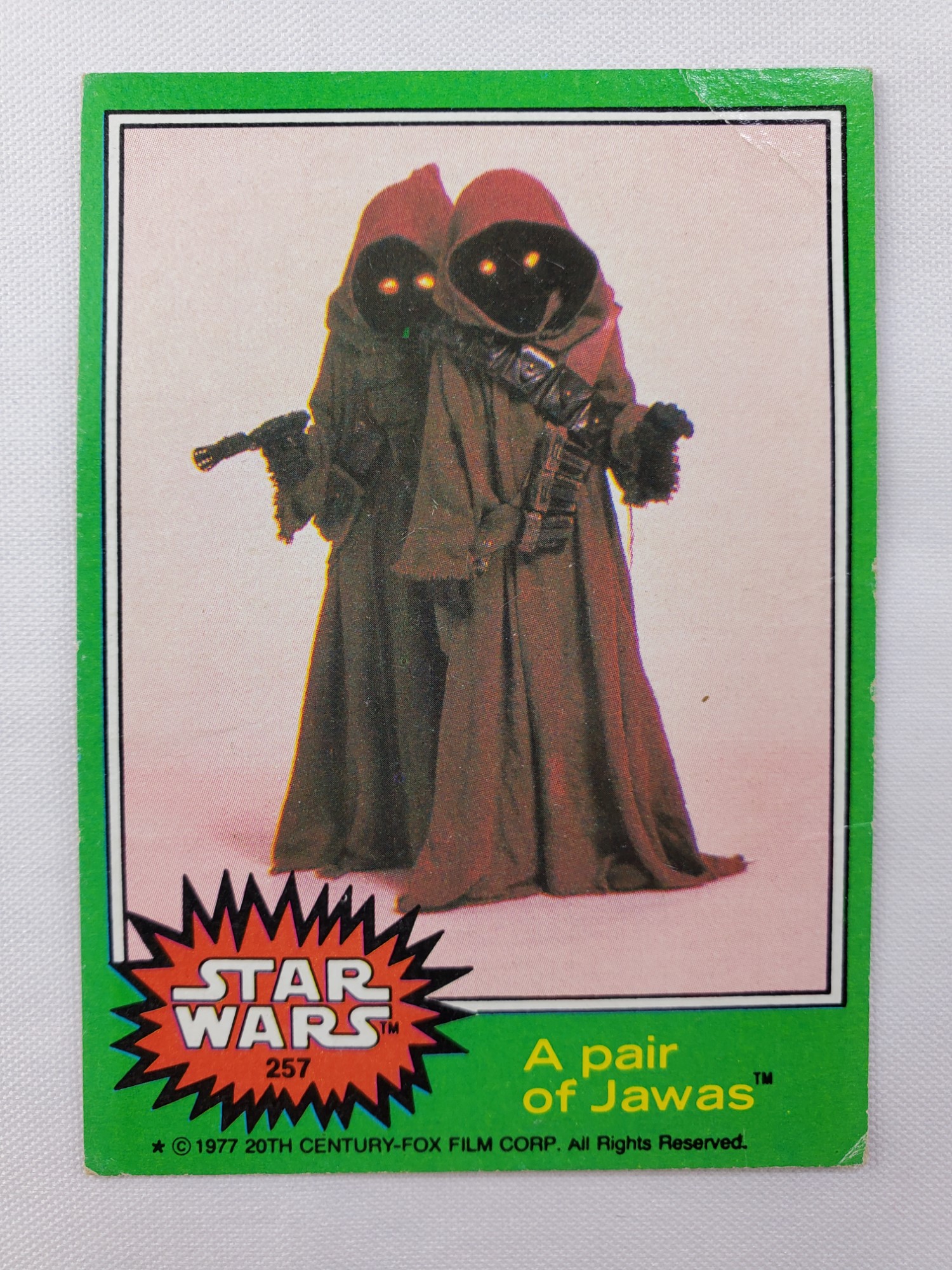 1977 Topps Star Wars Series 4 Trading Card #257 Green Border – A pair of Jawas. The Series 4 set was based on Star Wars: Episode IV A New Hope, and featured stills from the film, promotional photos and behind the scenes photos, all within a green border. Backs of the cards featured “Official Description” or “Movie Facts” themes, or included a portion of a larger image that could be pieced together with other cards like a puzzle.