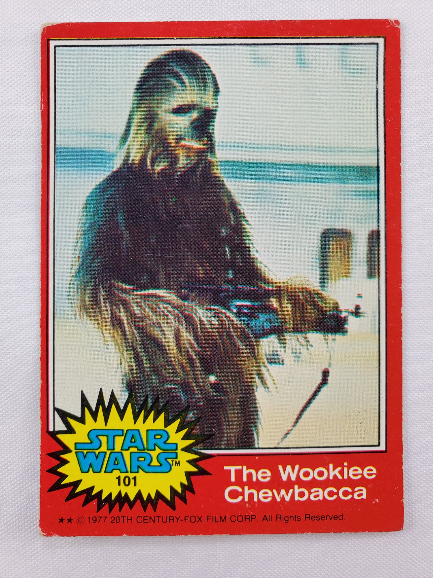 1977 Topps Star Wars Series 2 Trading Card #101 Red Border – The Wookie Chewbacca. The Series 2 set was based on Star Wars: Episode IV A New Hope, and featured stills from the film, promotional photos and behind the scenes photos, all within a red border. Backs of the cards featured “Actor’s Profile” or “Movie Facts” themes, or included a portion of a larger image that could be pieced together with other cards like a puzzle.