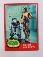 1977 Topps Star Wars Series 2 Trading Card #118 Red Border – R2-D2 and C-3PO. The back of the card has a tape residue square on the center of it. The Series 2 set was based on Star Wars: Episode IV A New Hope, and featured stills from the film, promotional photos and behind the scenes photos, all within a red border. Backs of the cards featured “Actor’s Profile” or “Movie Facts” themes, or included a portion of a larger image that could be pieced together with other cards like a puzzle.