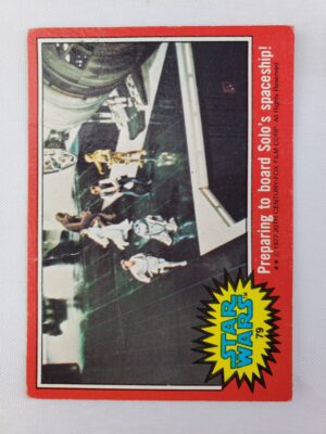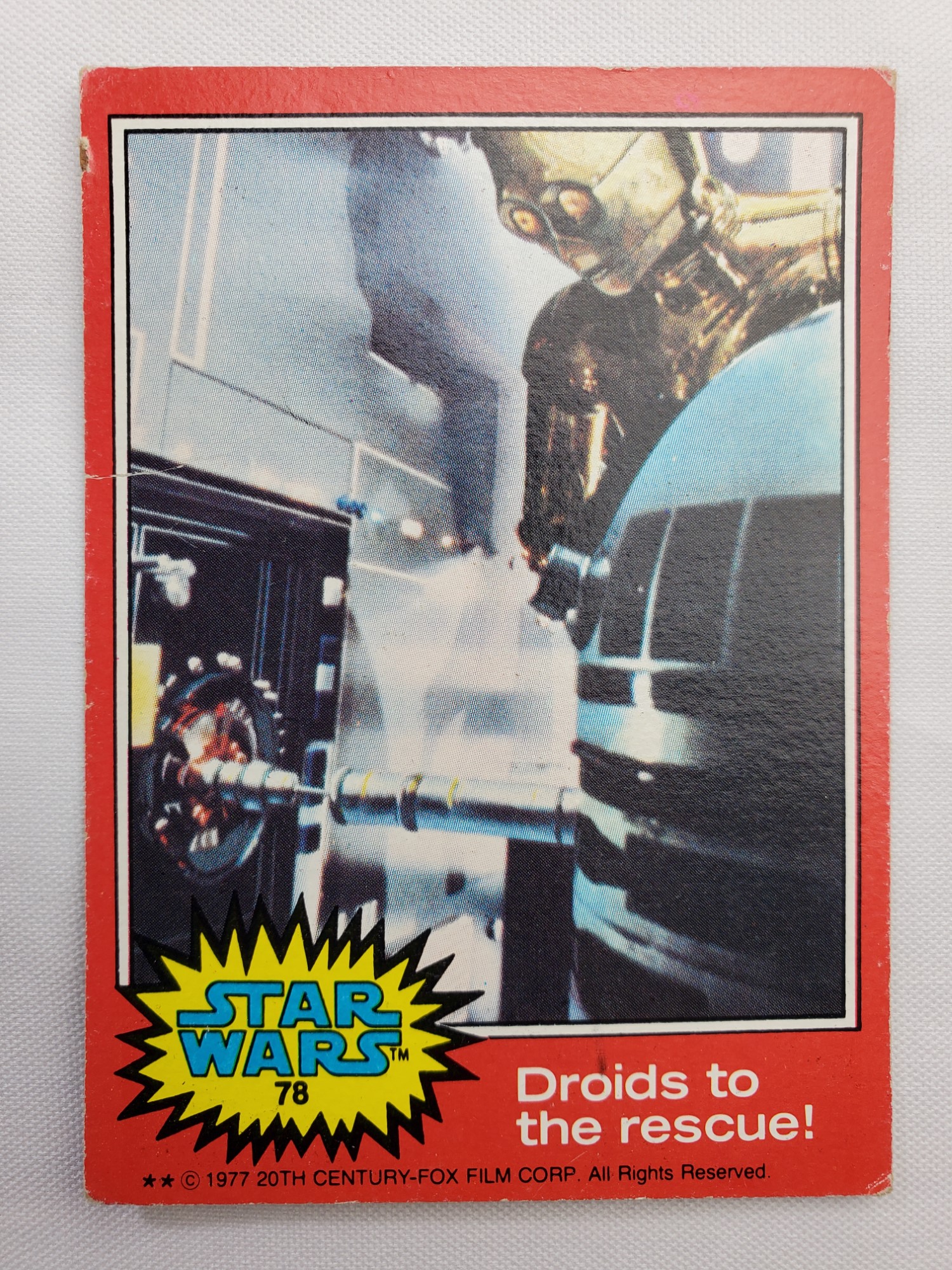 1977 Topps Star Wars Series 2 Trading Card #78 Red Border – Droids to the rescue! The Series 2 set was based on Star Wars: Episode IV A New Hope, and featured stills from the film, promotional photos and behind the scenes photos, all within a red border. Backs of the cards featured “Actor’s Profile” or “Movie Facts” themes, or included a portion of a larger image that could be pieced together with other cards like a puzzle.