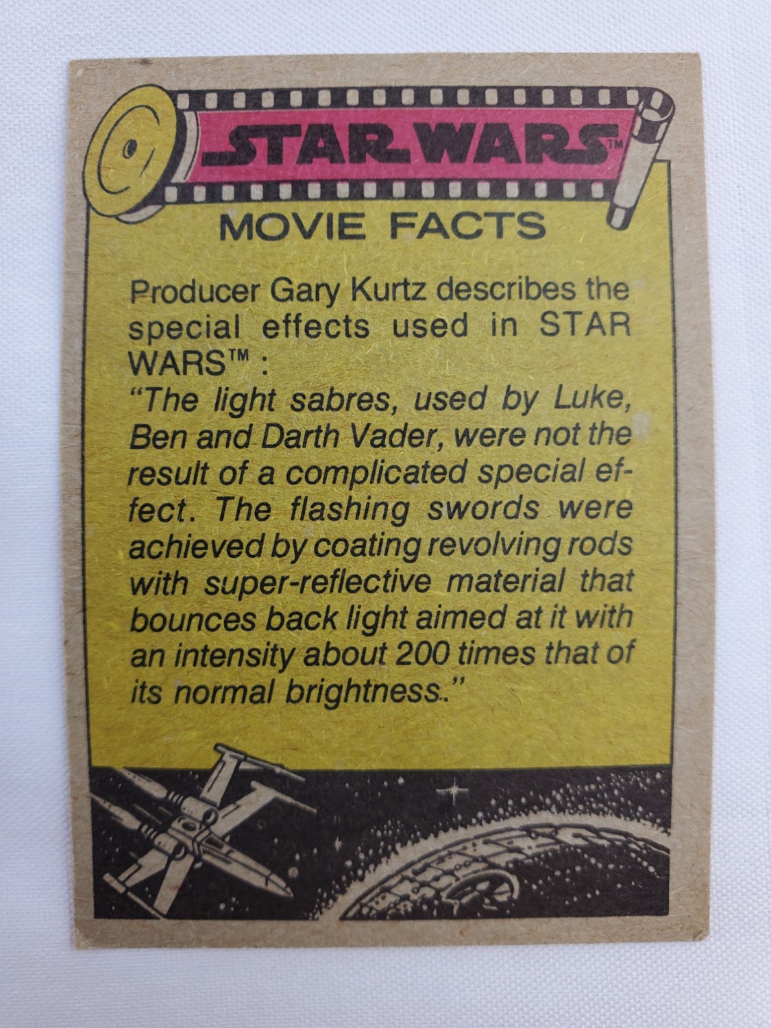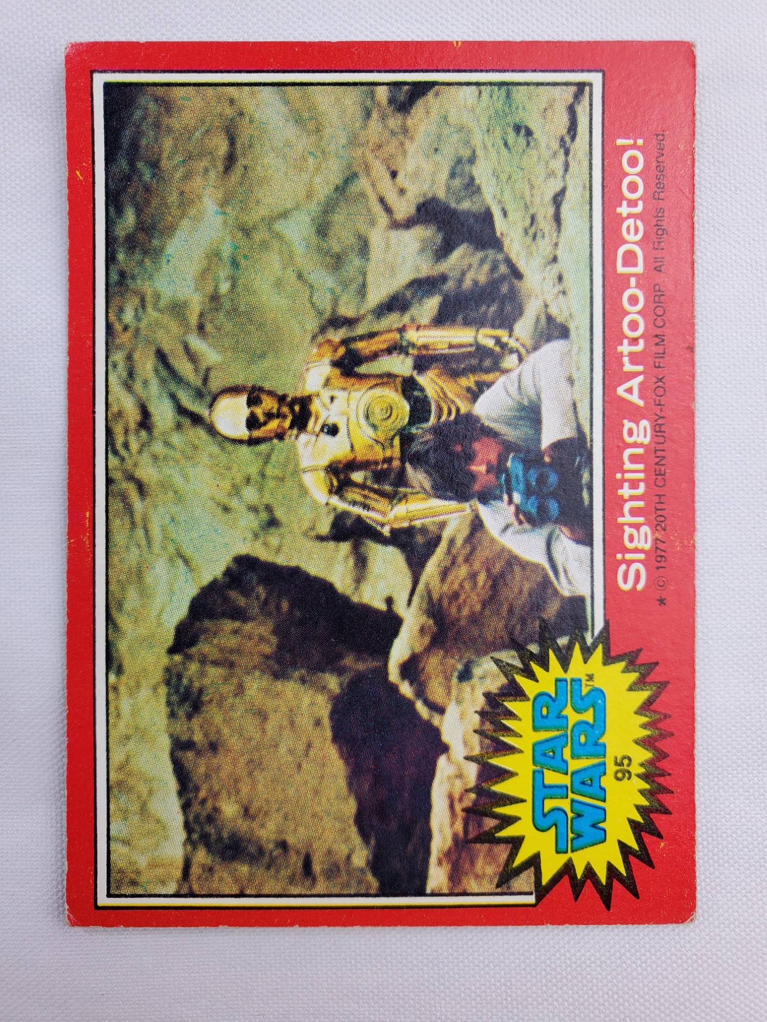 1977 Topps Star Wars Series 2 Trading Card #95 Red Border – Sighting Artoo-Detoo! The Series 2 set was based on Star Wars: Episode IV A New Hope, and featured stills from the film, promotional photos and behind the scenes photos, all within a red border. Backs of the cards featured “Actor’s Profile” or “Movie Facts” themes, or included a portion of a larger image that could be pieced together with other cards like a puzzle.