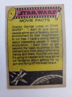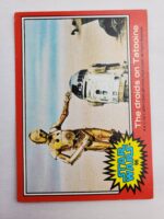 1977 Topps Star Wars Series 2 Trading Card #96 Red Border – The droids on Tatooine. The Series 2 set was based on Star Wars: Episode IV A New Hope, and featured stills from the film, promotional photos and behind the scenes photos, all within a red border. Backs of the cards featured “Actor’s Profile” or “Movie Facts” themes, or included a portion of a larger image that could be pieced together with other cards like a puzzle.
