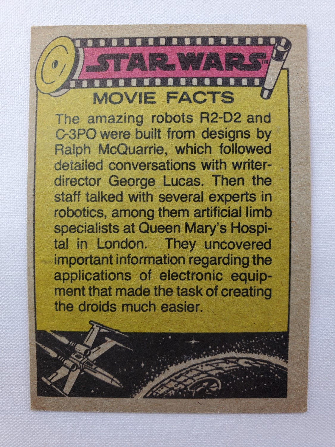 1977 Topps Star Wars Series 2 Trading Card #98 Red Border – See-Threepio. The Series 2 set was based on Star Wars: Episode IV A New Hope, and featured stills from the film, promotional photos and behind the scenes photos, all within a red border. Backs of the cards featured “Actor’s Profile” or “Movie Facts” themes, or included a portion of a larger image that could be pieced together with other cards like a puzzle.