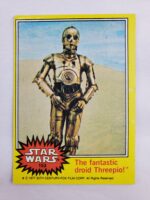 1977 Topps Star Wars Series 3 Trading Card #153 Yellow Border – The fantastic droid Threepio! The Series 3 set was based on Star Wars: Episode IV A New Hope, and featured stills from the film, promotional photos and behind the scenes photos, all within a yellow border. Backs of the cards featured an “Official Description” theme describing characters or vehicles, or included a portion of a larger image that could be pieced together with other cards like a puzzle.