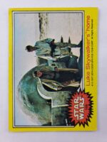 1977 Topps Star Wars Series 3 Trading Card #159 Yellow Border – Luke Skywalker’s home. The Series 3 set was based on Star Wars: Episode IV A New Hope, and featured stills from the film, promotional photos and behind the scenes photos, all within a yellow border. Backs of the cards featured an “Official Description” theme describing characters or vehicles, or included a portion of a larger image that could be pieced together with other cards like a puzzle.