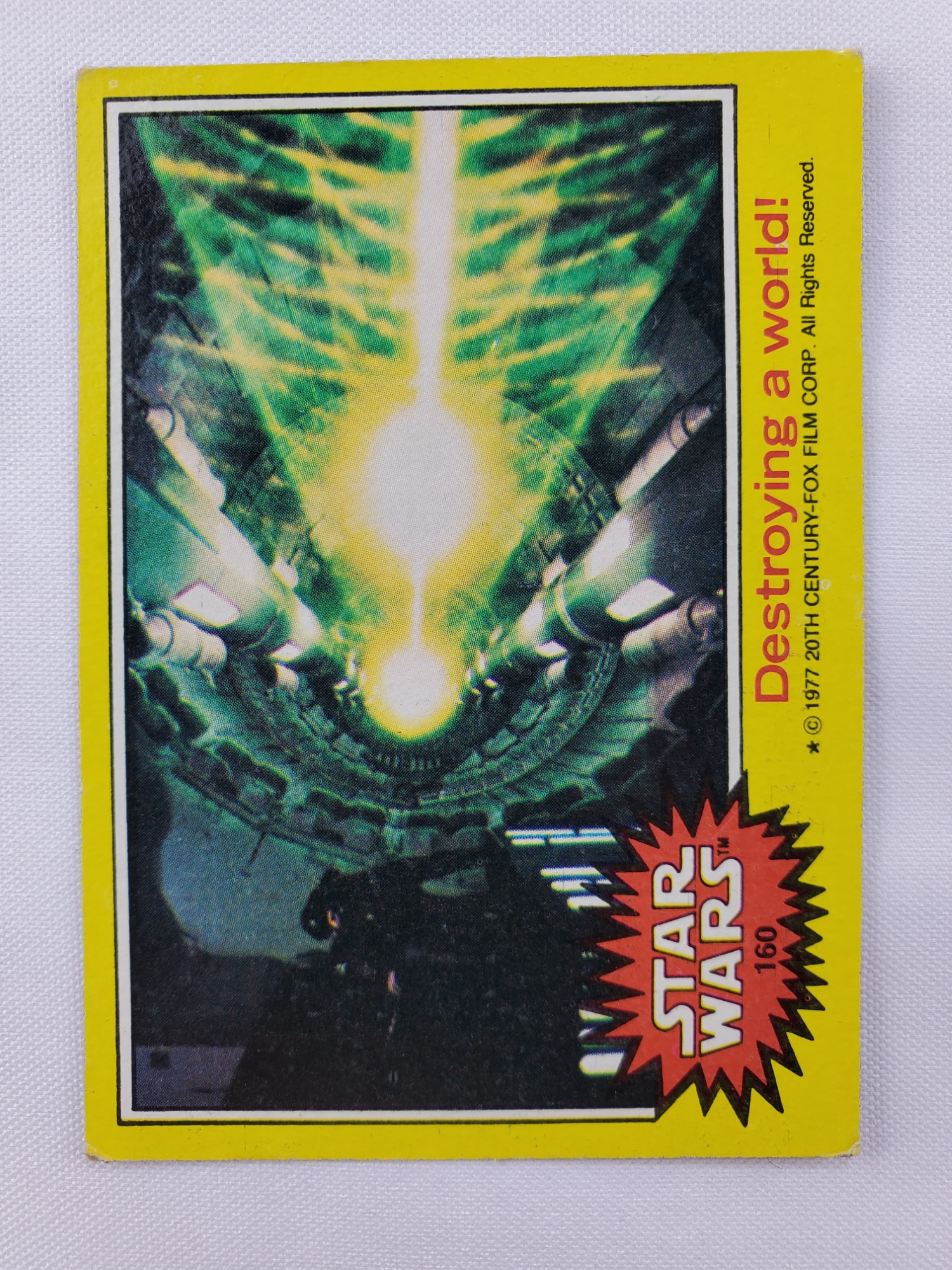1977 Topps Star Wars Series 3 Trading Card #160 Yellow Border – Destroying a world! The Series 3 set was based on Star Wars: Episode IV A New Hope, and featured stills from the film, promotional photos and behind the scenes photos, all within a yellow border. Backs of the cards featured an “Official Description” theme describing characters or vehicles, or included a portion of a larger image that could be pieced together with other cards like a puzzle.