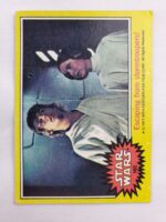 1977 Topps Star Wars Series 3 Trading Card #165 Yellow Border – Escaping from stormtroopers! The Series 3 set was based on Star Wars: Episode IV A New Hope, and featured stills from the film, promotional photos and behind the scenes photos, all within a yellow border. Backs of the cards featured an “Official Description” theme describing characters or vehicles, or included a portion of a larger image that could be pieced together with other cards like a puzzle.