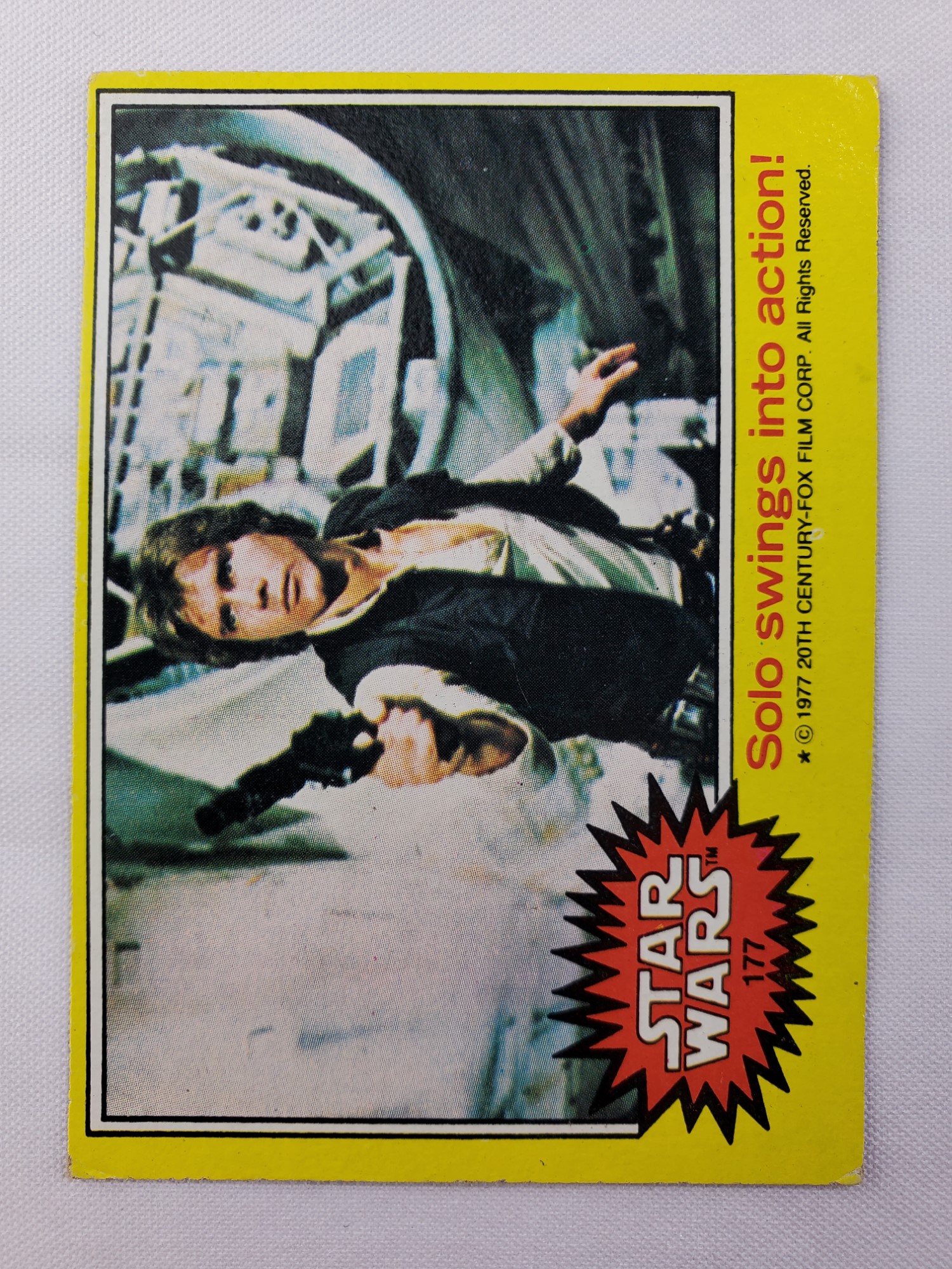 1977 Topps Star Wars Series 3 Trading Card #177 Yellow Border – Solo swings into action! The Series 3 set was based on Star Wars: Episode IV A New Hope, and featured stills from the film, promotional photos and behind the scenes photos, all within a yellow border. Backs of the cards featured an “Official Description” theme describing characters or vehicles, or included a portion of a larger image that could be pieced together with other cards like a puzzle.