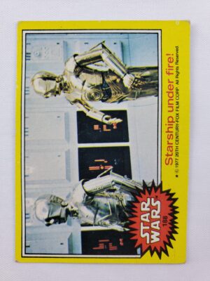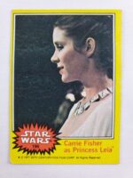 1977 Topps Star Wars Series 3 Trading Card #190 Yellow Border – Carrie Fisher as Princess Leia. The Series 3 set was based on Star Wars: Episode IV A New Hope, and featured stills from the film, promotional photos and behind the scenes photos, all within a yellow border. Backs of the cards featured an “Official Description” theme describing characters or vehicles, or included a portion of a larger image that could be pieced together with other cards like a puzzle.