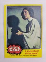 1977 Topps Star Wars Series 3 Trading Card #192 Yellow Border – Liberated Princess! The Series 3 set was based on Star Wars: Episode IV A New Hope, and featured stills from the film, promotional photos and behind the scenes photos, all within a yellow border. Backs of the cards featured an “Official Description” theme describing characters or vehicles, or included a portion of a larger image that could be pieced together with other cards like a puzzle.