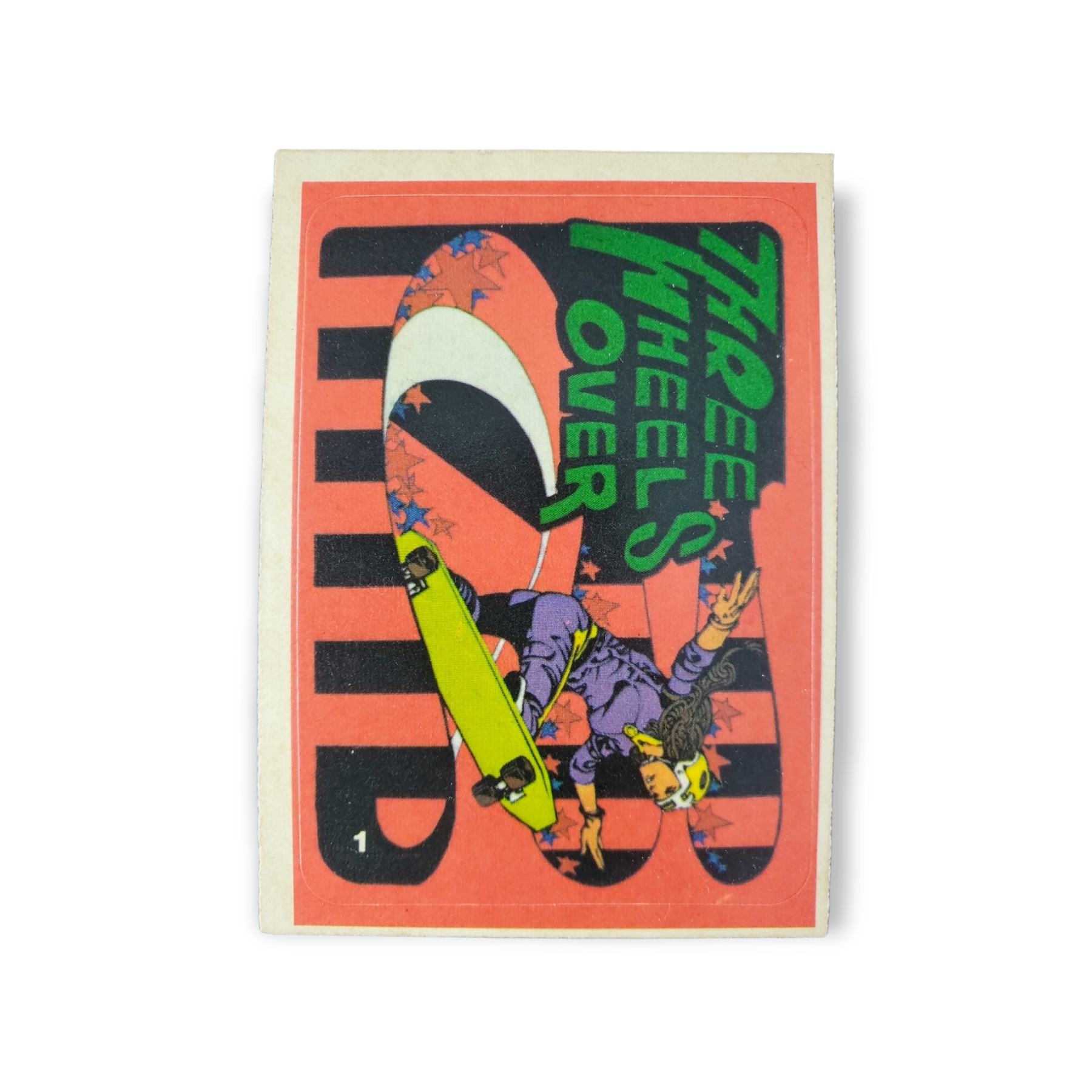 1978 Donruss All-Pro Skateboard Sticker #1 Three Wheels Over Sticker – Featuring Skateboarder Mike Goldman on the cards reverse along with stats and skateboarding summary.