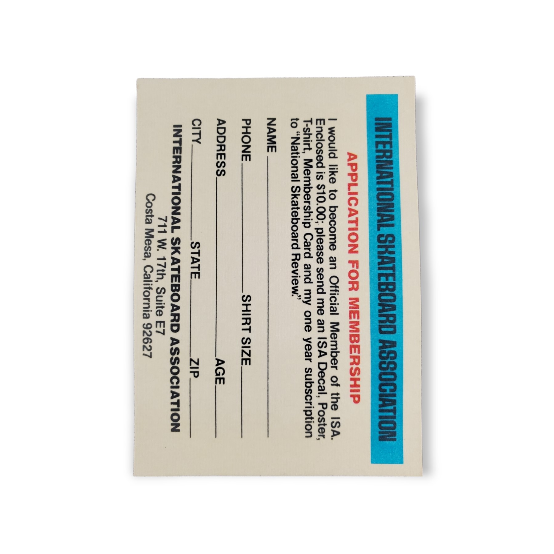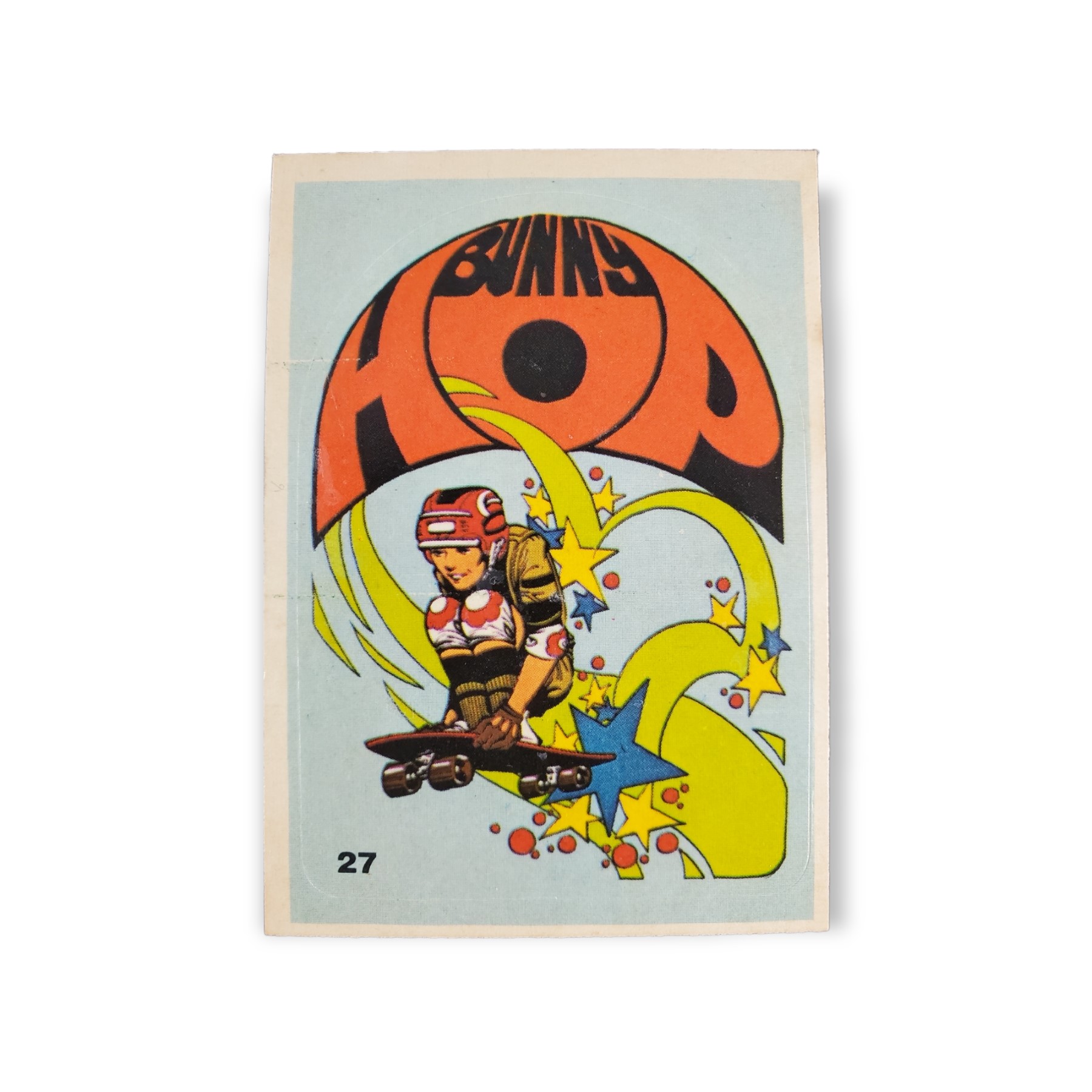 1978 Donruss All-Pro Skateboard Sticker #27 Bunny Hop Sticker – with a Membership submission form for the International Skateboard Association on the cards reverse. There is some minor wax residue on the card from the wax wrapper it came inside.
