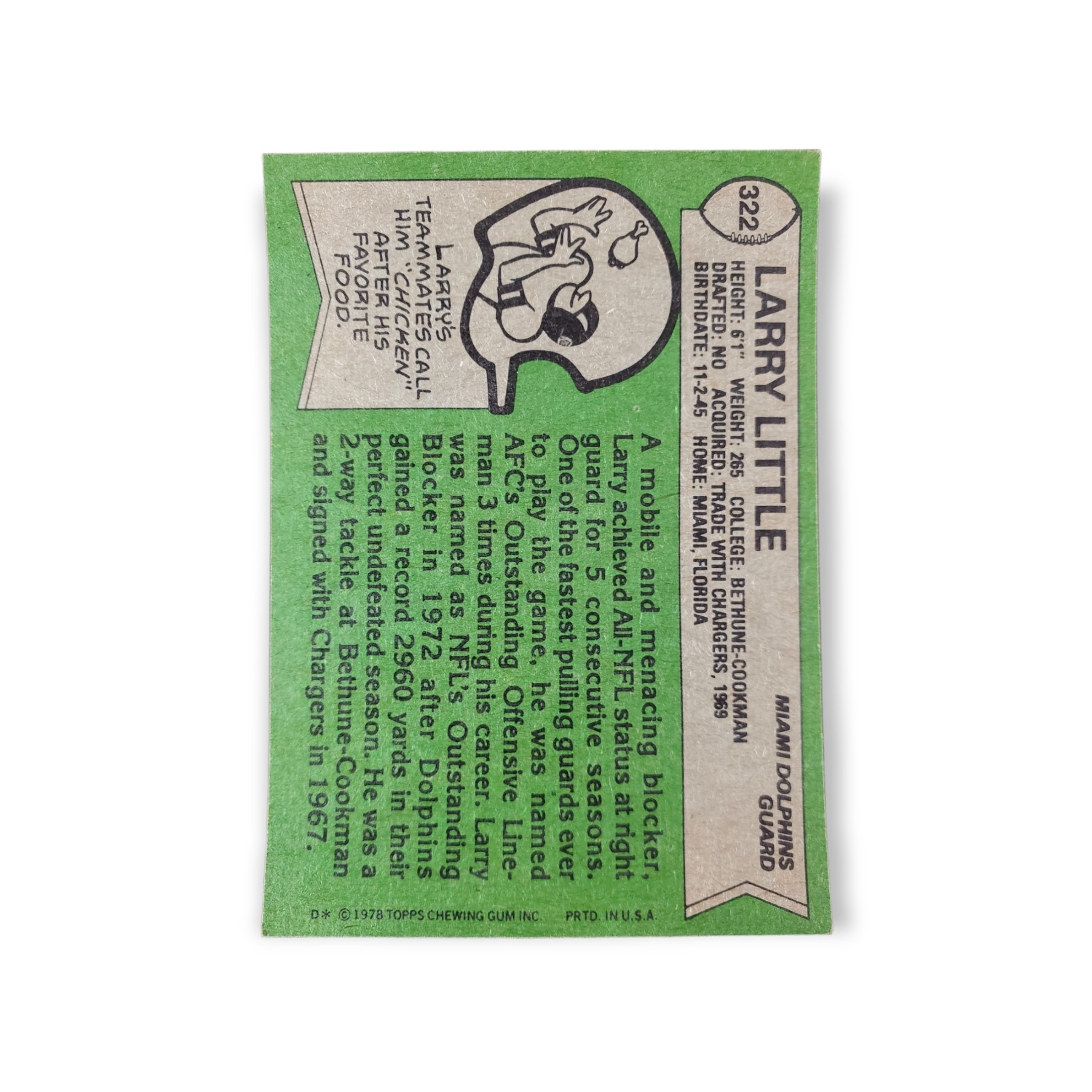 1978 Topps Football Larry Little Card #322 Miami Dolphins Trading Card
