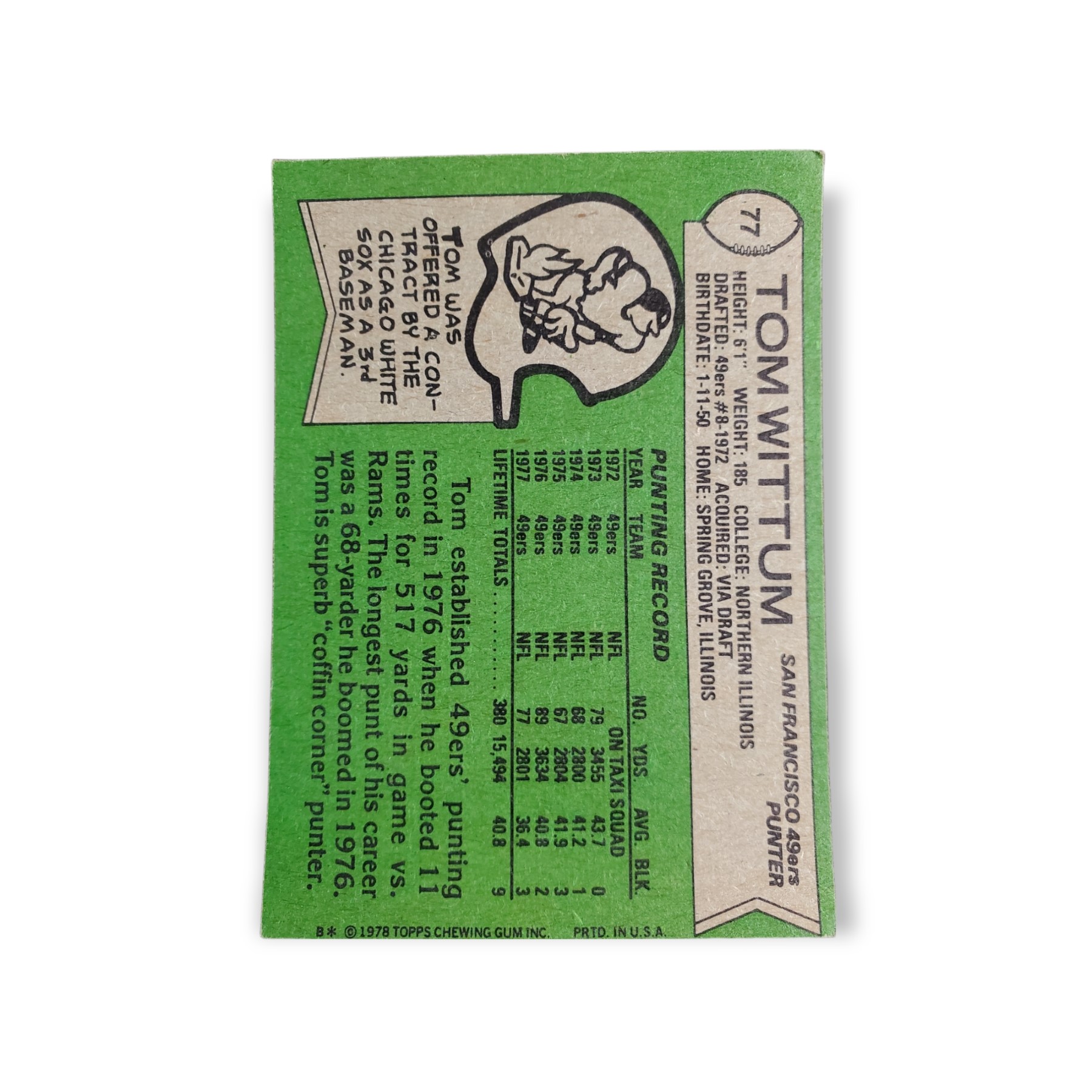 1978 Topps Football Tom Wittum Card #77 San Francisco 49ers Trading Card