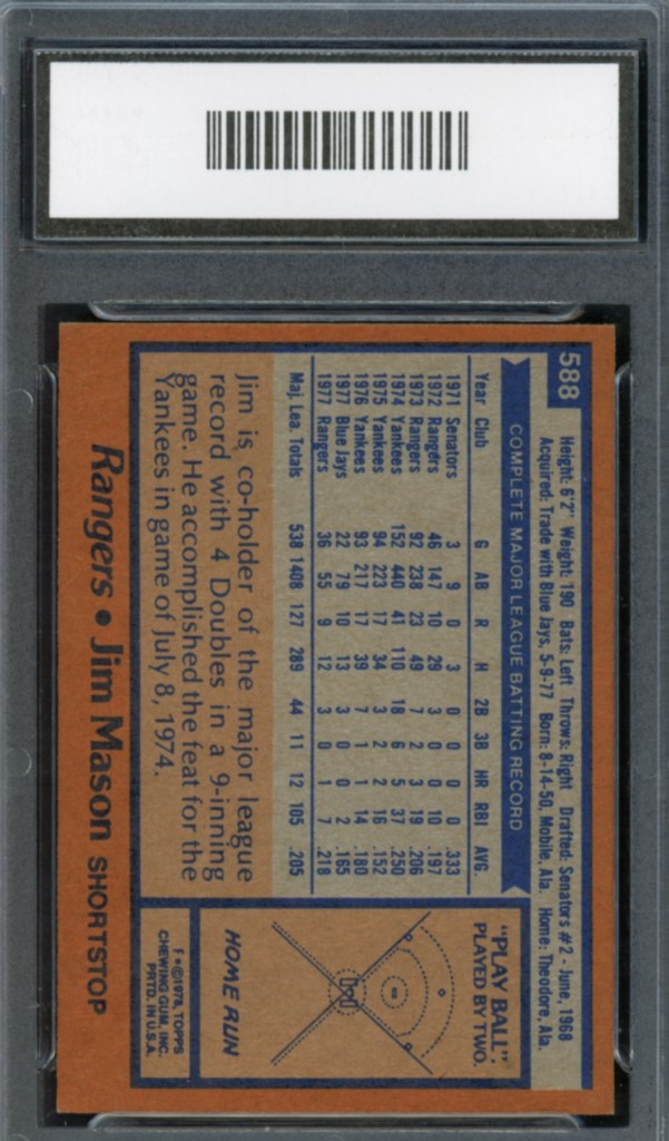 1978 Topps Jim Mason Texas Rangers Baseball Card #588 – GMA Professional Graded 7 NM