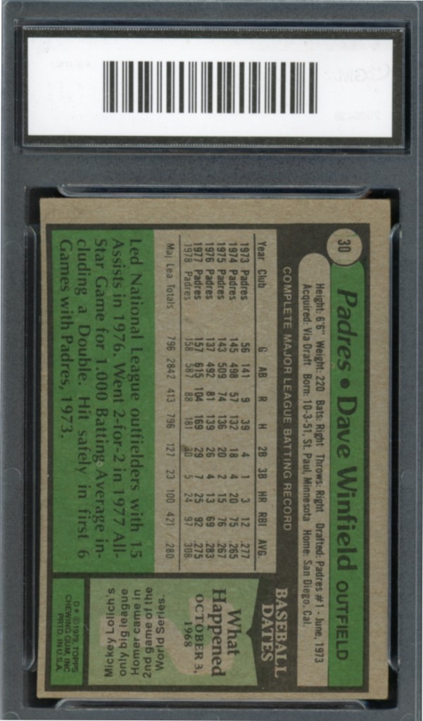 1979 Topps Dave Winfield San Diego Padres Baseball Card #30 – GMA Professional Graded 7 NM