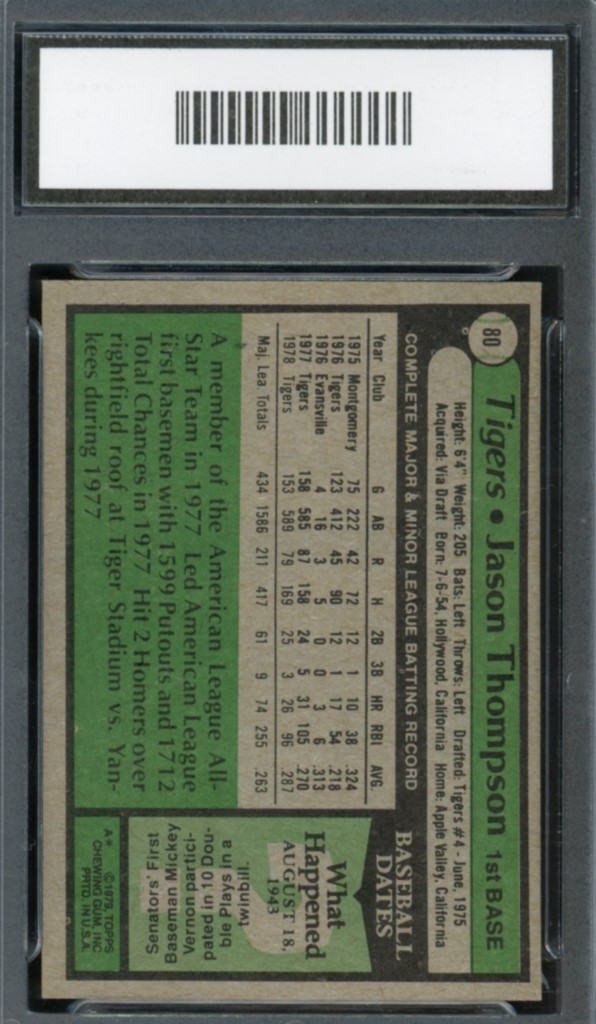 1979 Topps Jason Thompson Detroit Tigers Baseball Card #80 – GMA Professional Graded 8.5 NM-MT+