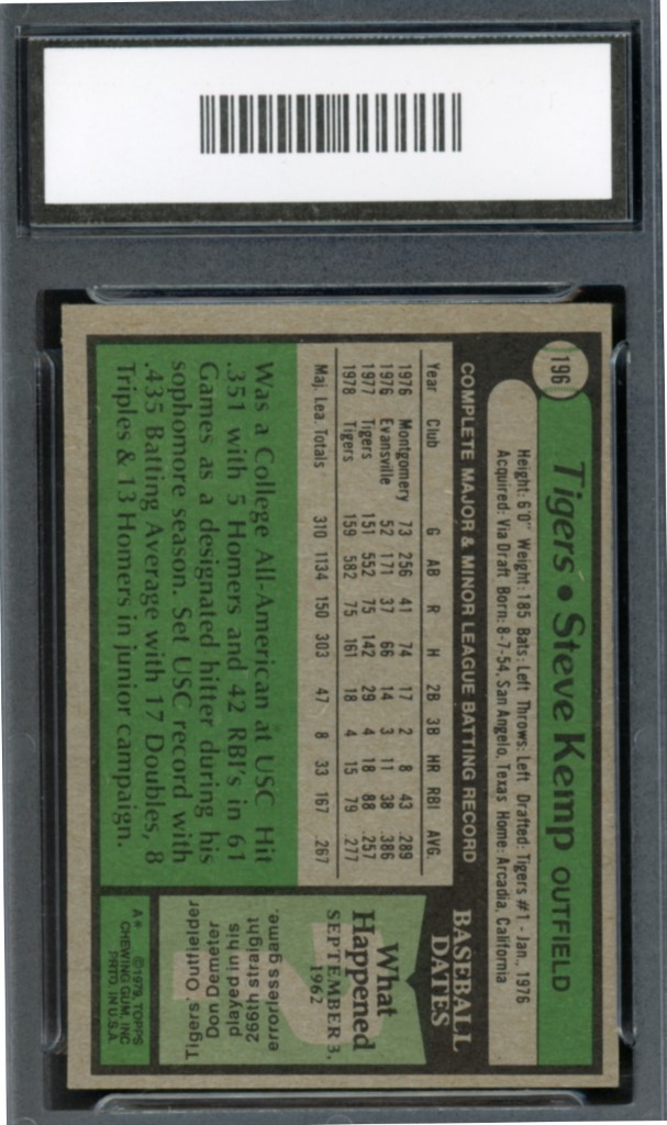 1979 Topps Steve Kemp Detroit Tigers Baseball Card #196 – GMA Professional Graded 8 NM-MT