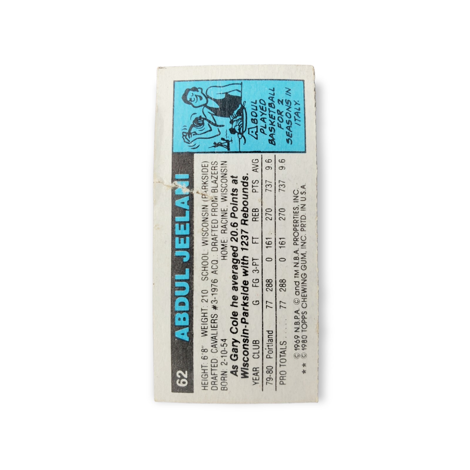 1980-81 Topps Basketball Abdul Jeelani Card #62 Dallas Mavericks Trading Card. There is a small tear in the card. This card was originally one of three mini-individual card panels that together formed a larger standard size trading card with three perforated sections. Each card measures approximately 1 1/6″ X 2 1/2″.