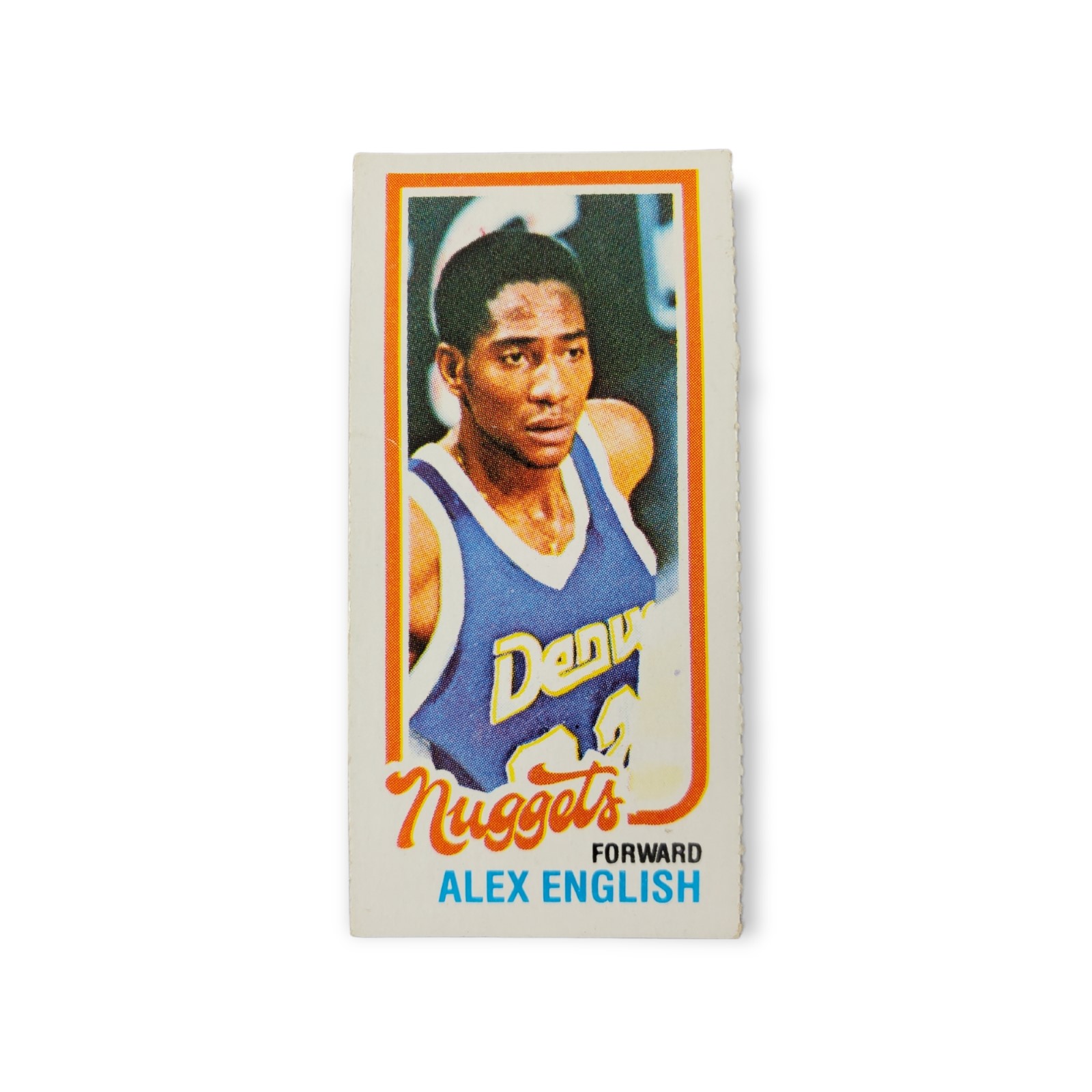 1980-81 Topps Basketball Alex English Card #75 Denver Nuggets Trading Card. This card was originally one of three mini-individual card panels that together formed a larger standard size trading card with three perforated sections. Each card measures approximately 1 1/6″ X 2 1/2″.