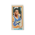 1980-81 Topps Basketball Alex English Card #75 Denver Nuggets Trading Card. This card was originally one of three mini-individual card panels that together formed a larger standard size trading card with three perforated sections. Each card measures approximately 1 1/6″ X 2 1/2″.