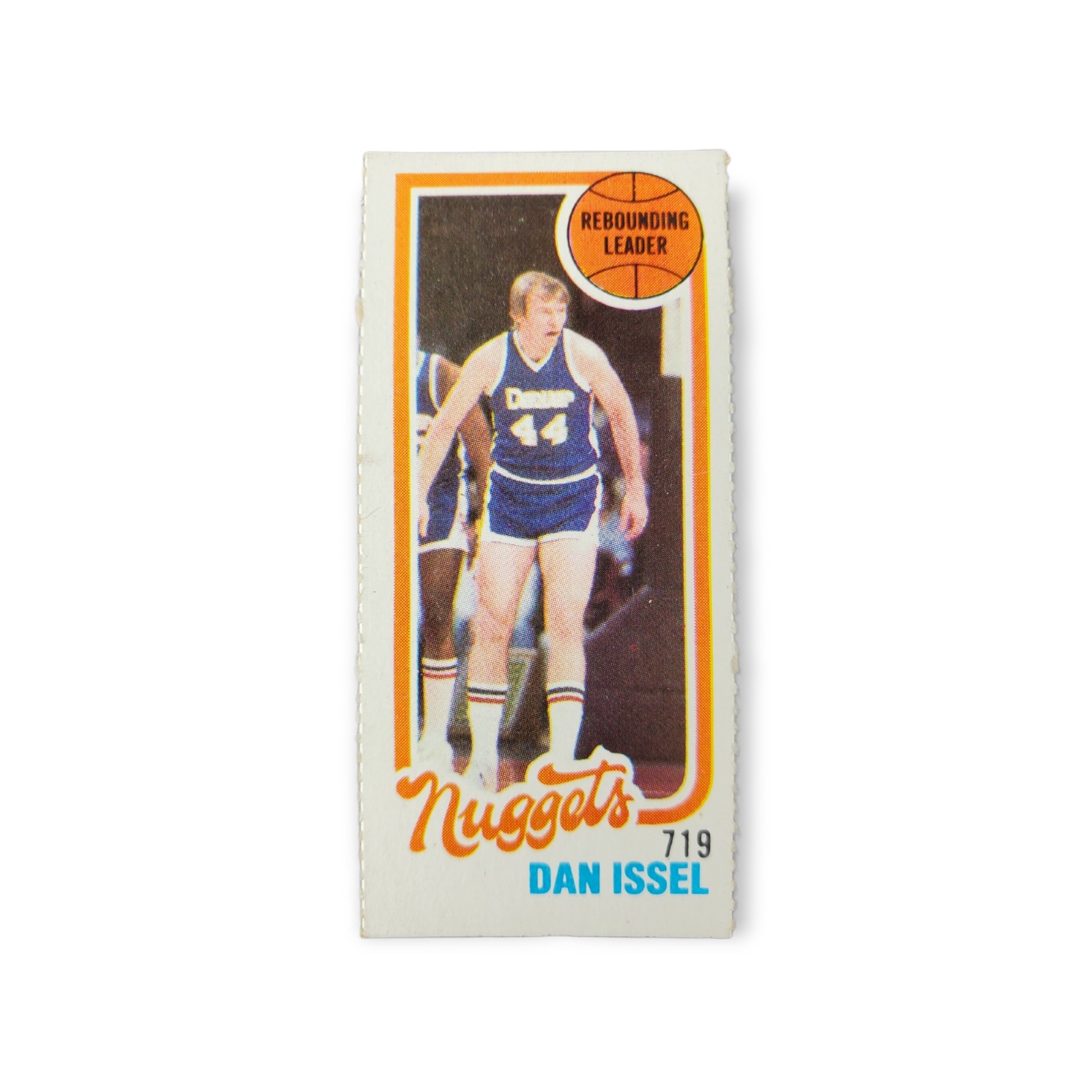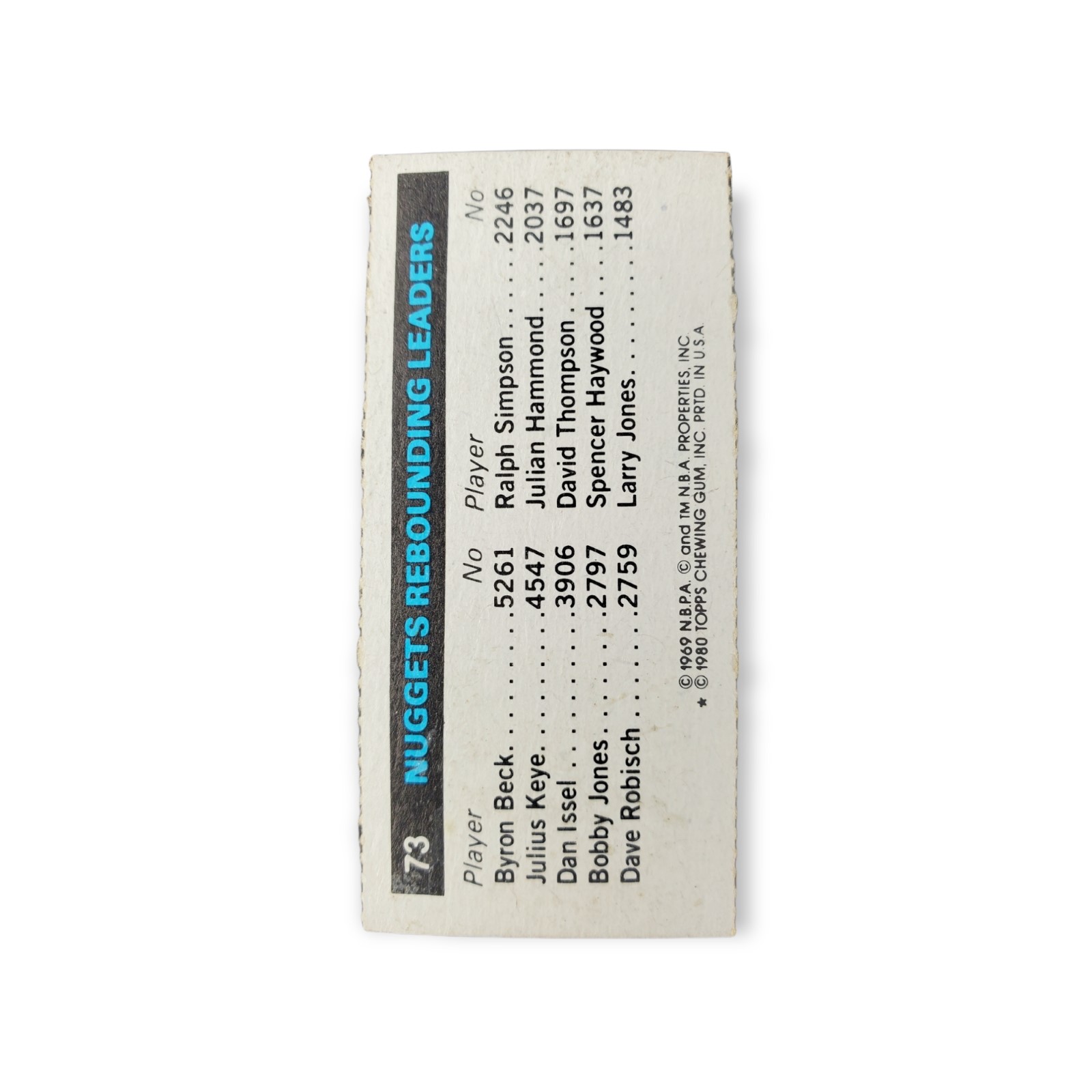 1980-81 Topps Basketball Dan Issel Card #73 Rebounding Leader Denver Nuggets Trading Card. This card was originally one of three mini-individual card panels that together formed a larger standard size trading card with three perforated sections. Each card measures approximately 1 1/6″ X 2 1/2″.