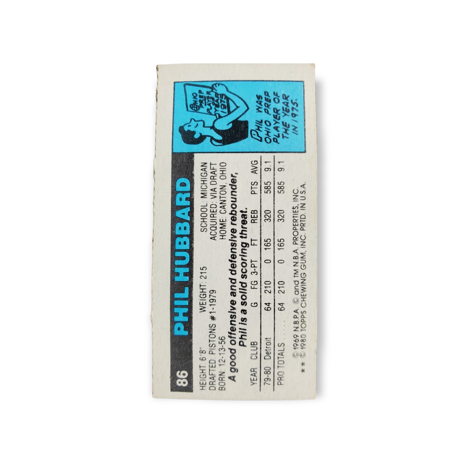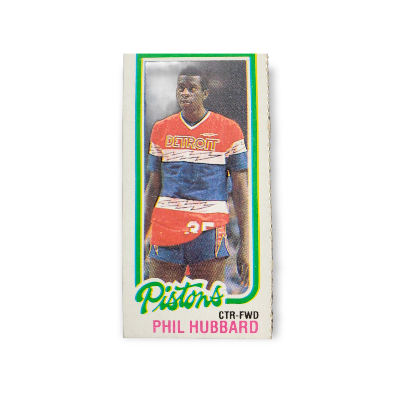 1980-81 Topps Basketball Phil Hubbard Rookie Card #86 Detroit Pistons Trading Card. This card was originally one of three mini-individual card panels that together formed a larger standard size trading card with three perforated sections. Each card measures approximately 1 1/6″ X 2 1/2″.