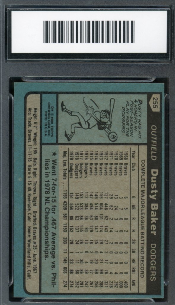 1980 Topps Dusty Baker Los Angeles Dodgers Baseball Card #255 – GMA Professional Graded 8.5 NM-MT+