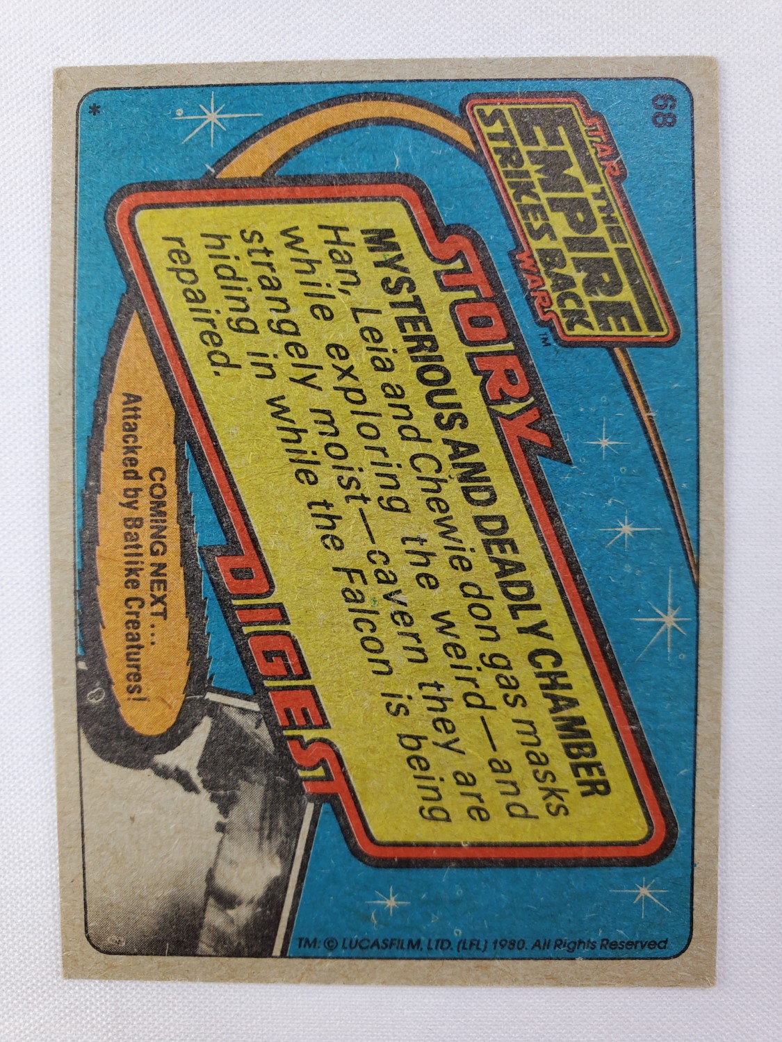 1980 Topps Star Wars: The Empire Strikes Back Series 1 Trading Card #68 – Mysterious and Deadly Chamber. The Empire Strikes Back Series 1 set is based on Star Wars: Episode V The Empire Strikes Back, and features stills from the film and promotional photos, all within a red and silver border. The first 10 cards are “Star File” character profile cards. The “Story Digest” themed cards tell the story of the movie on the back, and “Space Paintings” cards feature Ralph McQuarrie concept art on the front and “Movie Facts” on the back.
