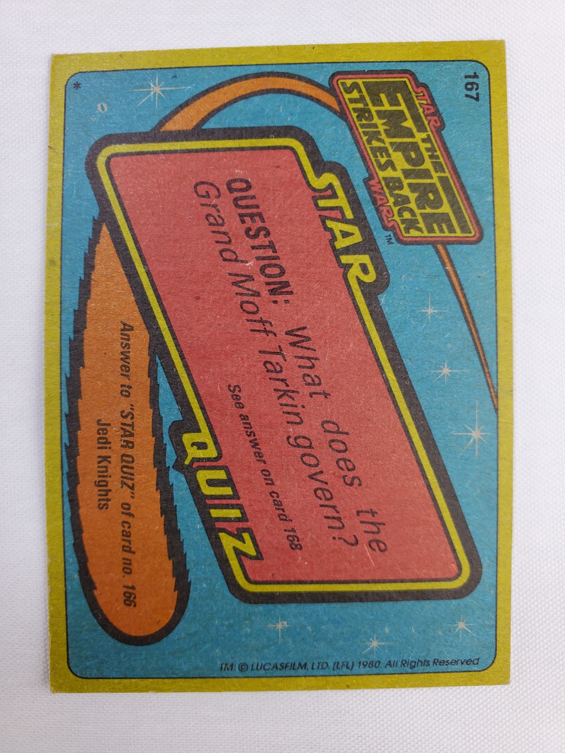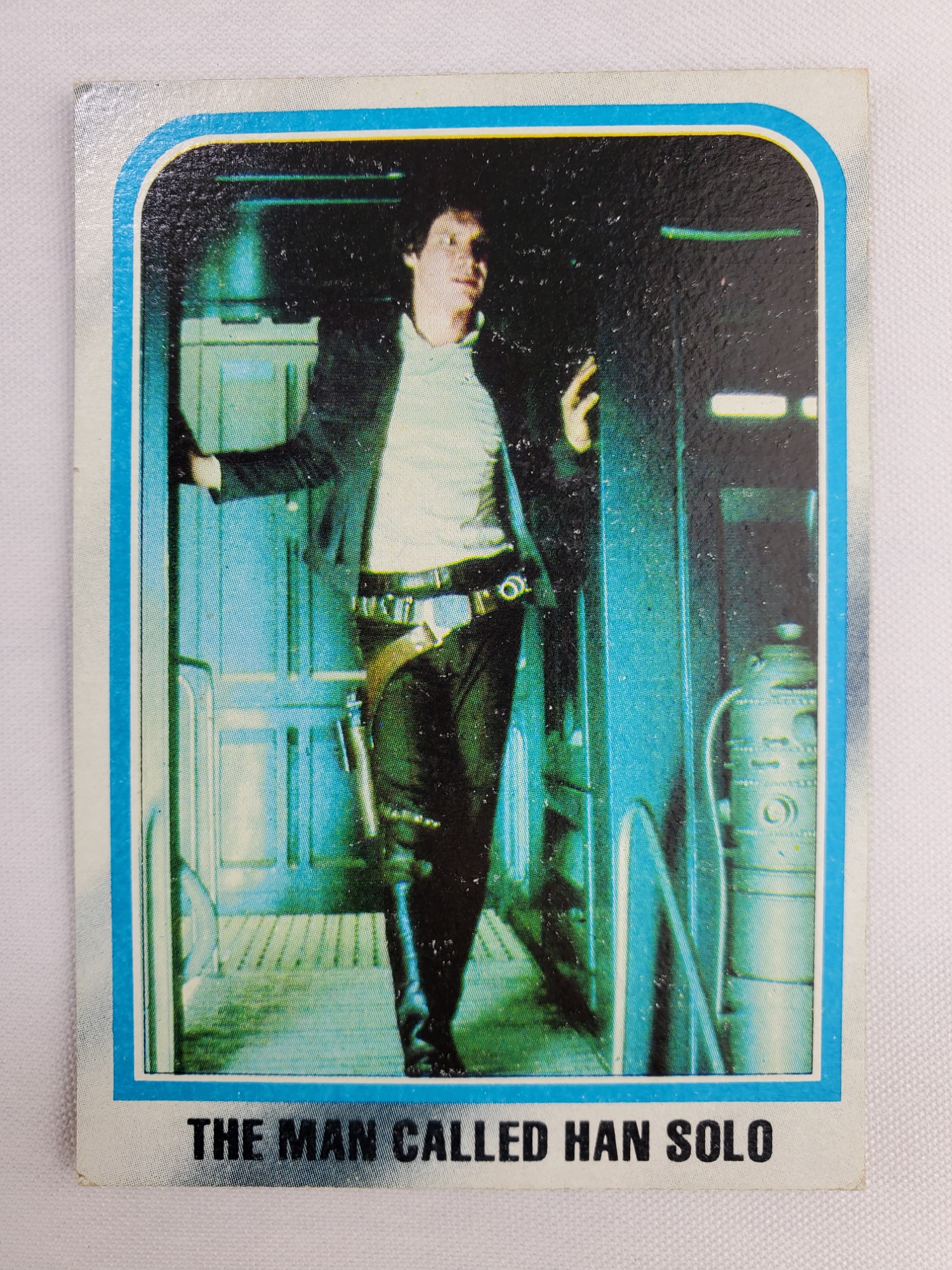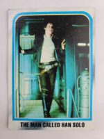 1980 Topps Star Wars: The Empire Strikes Back Series 2 Trading Card #167 – The Man Called Han Solo. The Empire Strikes Back Series 2 set is based on Star Wars: Episode V The Empire Strikes Back, and features stills from the film, promotional photos, and behind the scenes photos all within a blue and silver border. The first 10 cards are “Starcraft” vehicle profile cards. The “Star Quiz” themed cards display trivia questions on the back and “Movie Facts” cards include production photos with information on the back.