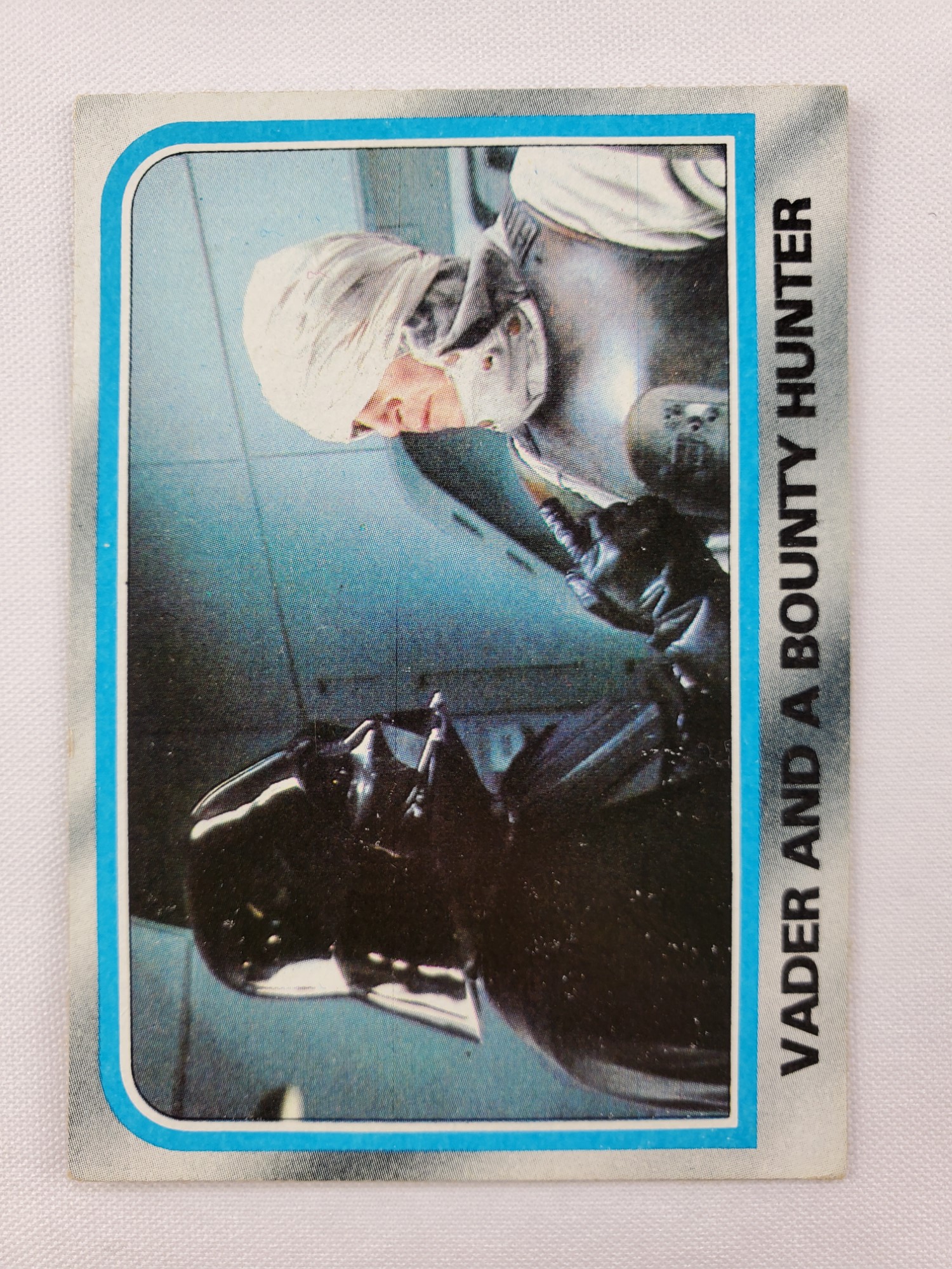 1980 Topps Star Wars: The Empire Strikes Back Series 2 Trading Card #181 – Vader and a Bounty Hunter. The Empire Strikes Back Series 2 set is based on Star Wars: Episode V The Empire Strikes Back, and features stills from the film, promotional photos, and behind the scenes photos all within a blue and silver border. The first 10 cards are “Starcraft” vehicle profile cards. The “Star Quiz” themed cards display trivia questions on the back and “Movie Facts” cards include production photos with information on the back.