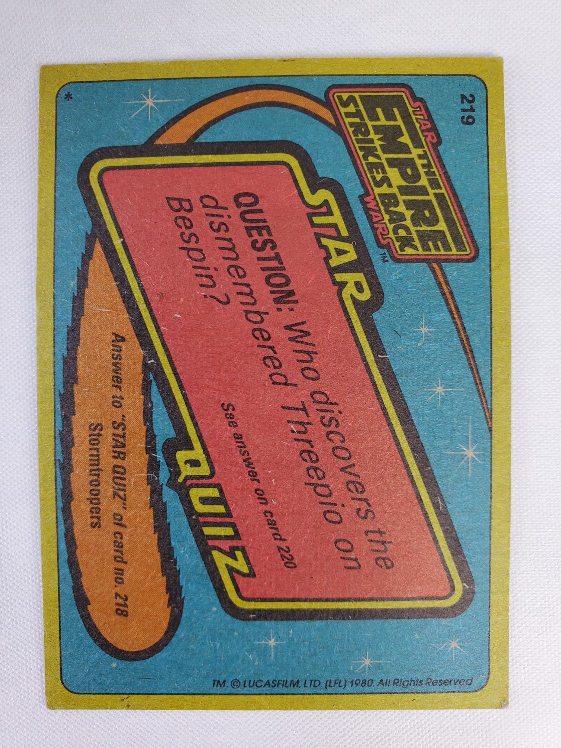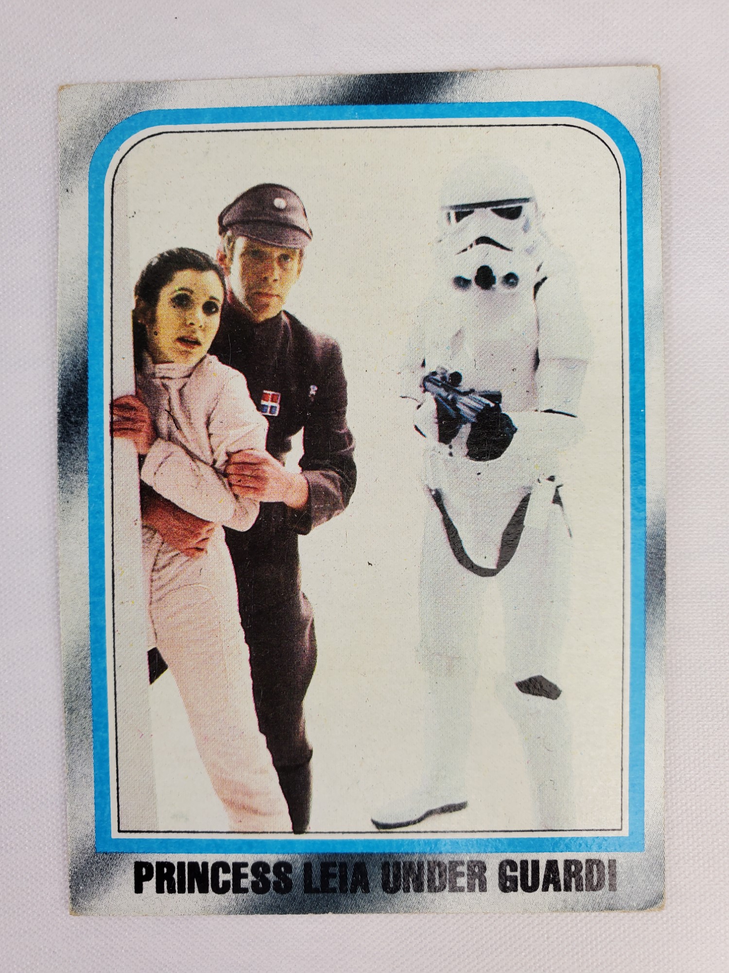 1980 Topps Star Wars: The Empire Strikes Back Series 2 Trading Card #219 – Princess Leia Under Guard! The Empire Strikes Back Series 2 set is based on Star Wars: Episode V The Empire Strikes Back, and features stills from the film, promotional photos, and behind the scenes photos all within a blue and silver border. The first 10 cards are “Starcraft” vehicle profile cards. The “Star Quiz” themed cards display trivia questions on the back and “Movie Facts” cards include production photos with information on the back.