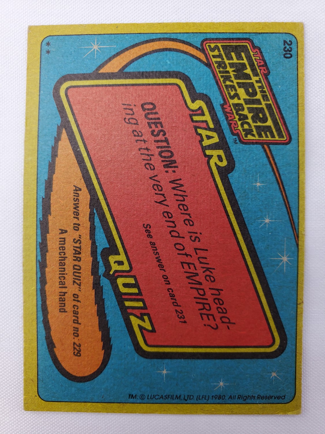 1980 Topps Star Wars: The Empire Strikes Back Series 2 Trading Card #230 – Mynocks Outside? Oh My! The Empire Strikes Back Series 2 set is based on Star Wars: Episode V The Empire Strikes Back, and features stills from the film, promotional photos, and behind the scenes photos all within a blue and silver border. The first 10 cards are “Starcraft” vehicle profile cards. The “Star Quiz” themed cards display trivia questions on the back and “Movie Facts” cards include production photos with information on the back.