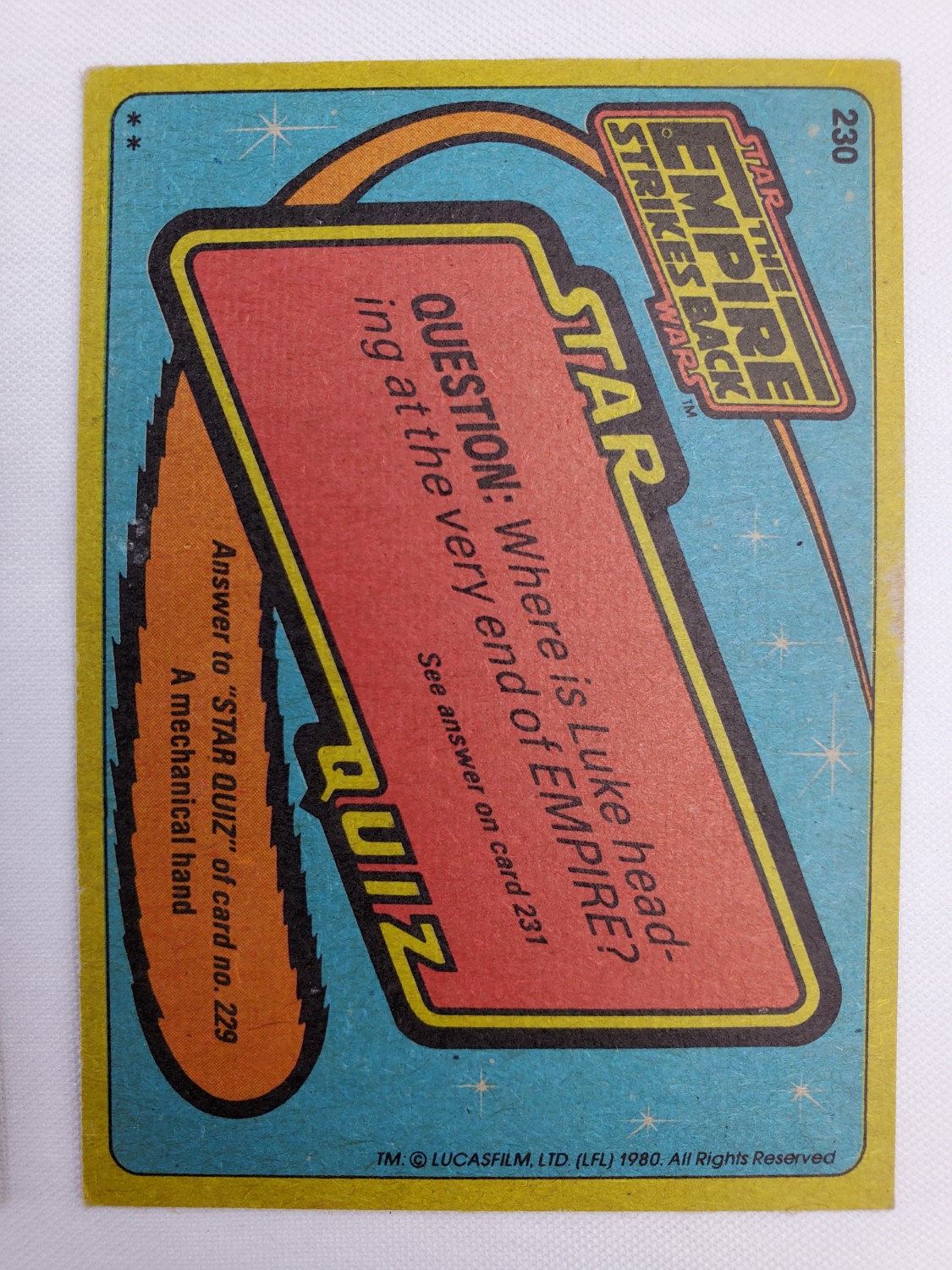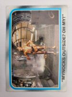 1980 Topps Star Wars: The Empire Strikes Back Series 2 Trading Card #230 – Mynocks Outside? Oh My! The Empire Strikes Back Series 2 set is based on Star Wars: Episode V The Empire Strikes Back, and features stills from the film, promotional photos, and behind the scenes photos all within a blue and silver border. The first 10 cards are “Starcraft” vehicle profile cards. The “Star Quiz” themed cards display trivia questions on the back and “Movie Facts” cards include production photos with information on the back.