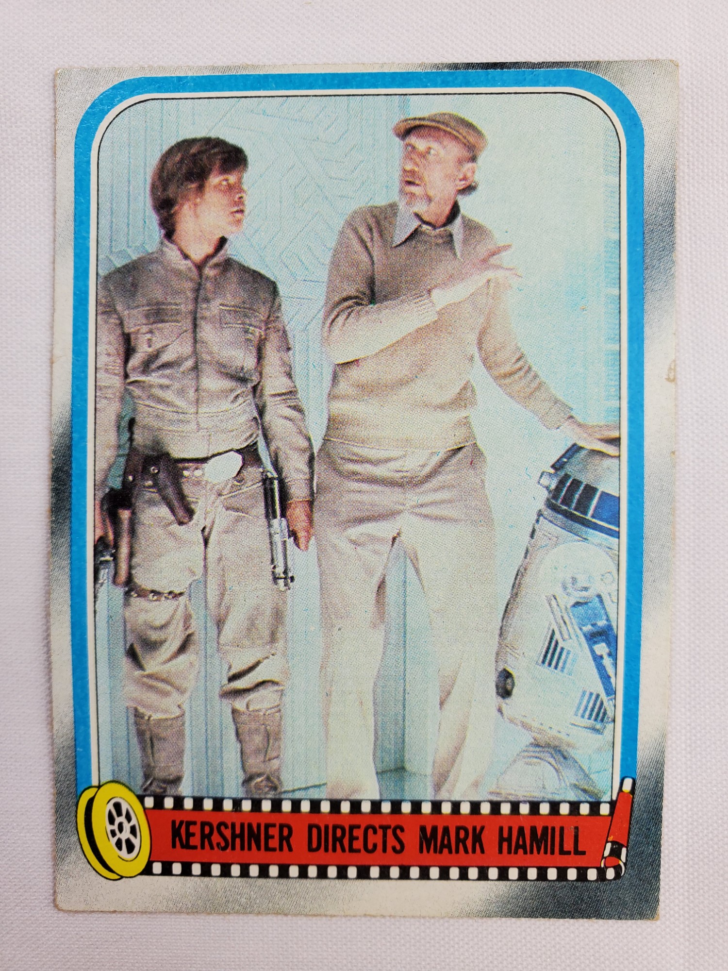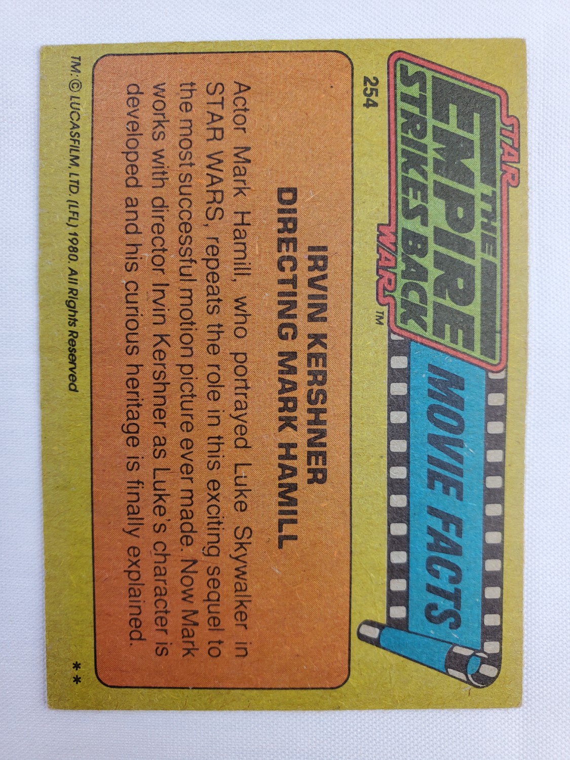 1980 Topps Star Wars: The Empire Strikes Back Series 2 Trading Card #254 – Kershner Directs Mark Hamill. The Empire Strikes Back Series 2 set is based on Star Wars: Episode V The Empire Strikes Back, and features stills from the film, promotional photos, and behind the scenes photos all within a blue and silver border. The first 10 cards are “Starcraft” vehicle profile cards. The “Star Quiz” themed cards display trivia questions on the back and “Movie Facts” cards include production photos with information on the back.