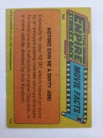 1980 Topps Star Wars: The Empire Strikes Back Series 2 Trading Card #262 – Acting Can Be a Dirty Job! The Empire Strikes Back Series 2 set is based on Star Wars: Episode V The Empire Strikes Back, and features stills from the film, promotional photos, and behind the scenes photos all within a blue and silver border. The first 10 cards are “Starcraft” vehicle profile cards. The “Star Quiz” themed cards display trivia questions on the back and “Movie Facts” cards include production photos with information on the back.