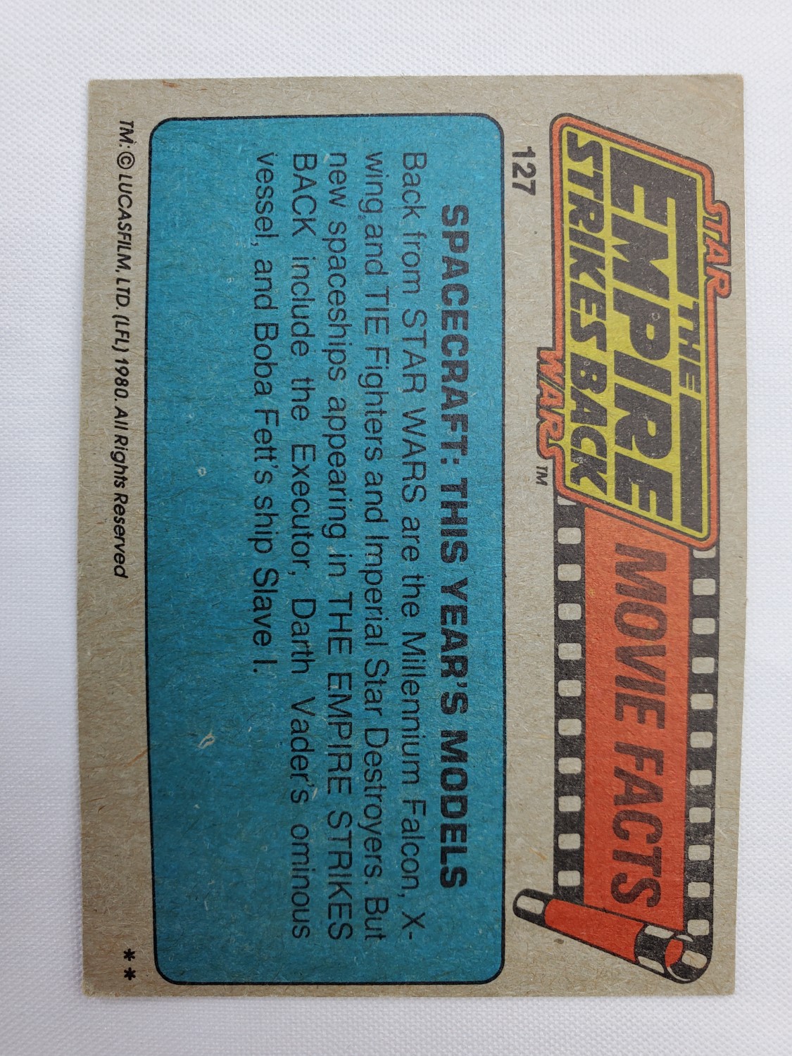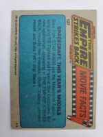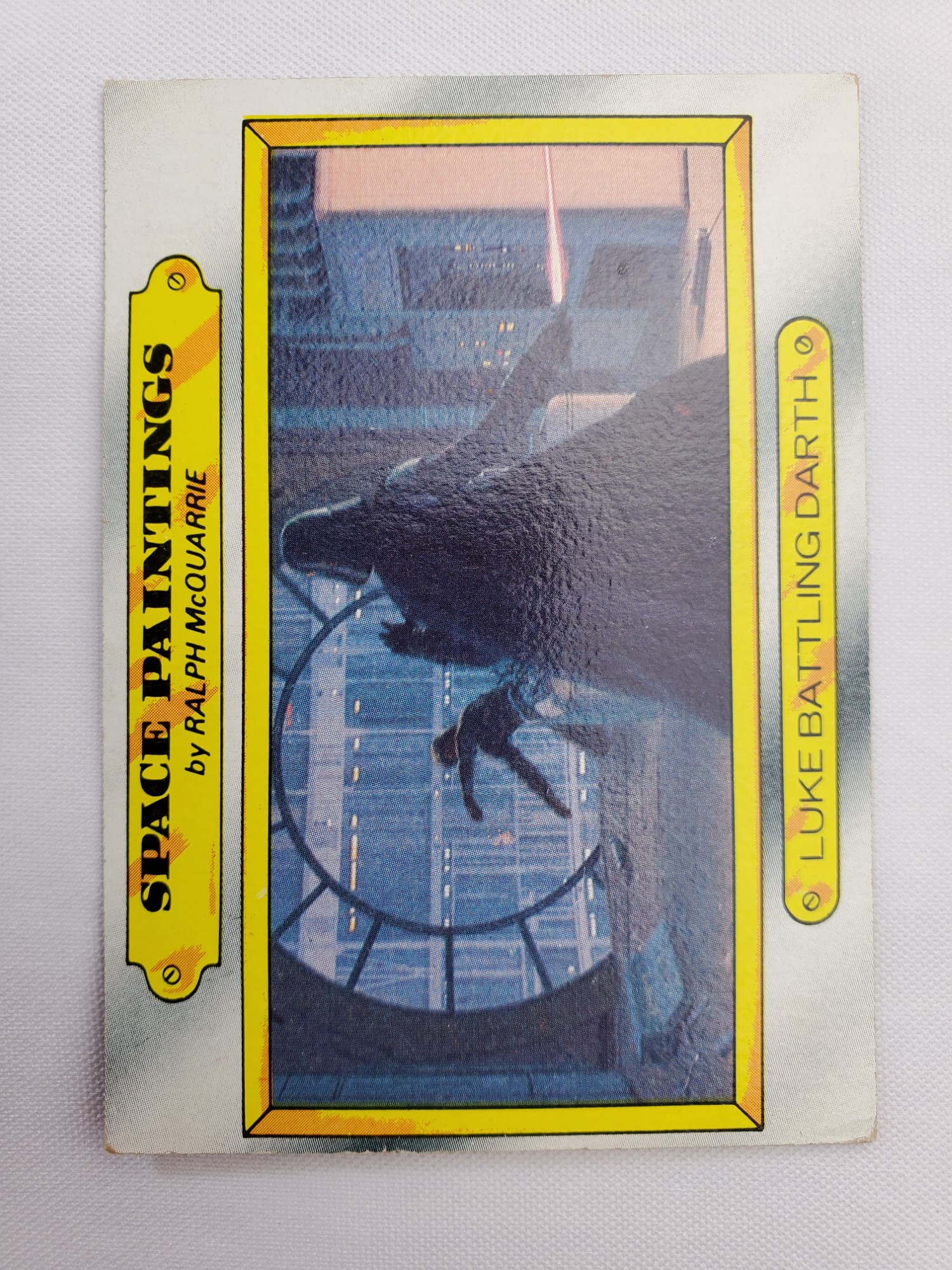 1980 Topps Star Wars: The Empire Strikes Back Series 1 Trading Card #127 – Luke Battling Darth. The Empire Strikes Back Series 1 set is based on Star Wars: Episode V The Empire Strikes Back, and features stills from the film and promotional photos, all within a red and silver border. The first 10 cards are “Star File” character profile cards. The “Story Digest” themed cards tell the story of the movie on the back, and “Space Paintings” cards feature Ralph McQuarrie concept art on the front and “Movie Facts” on the back.