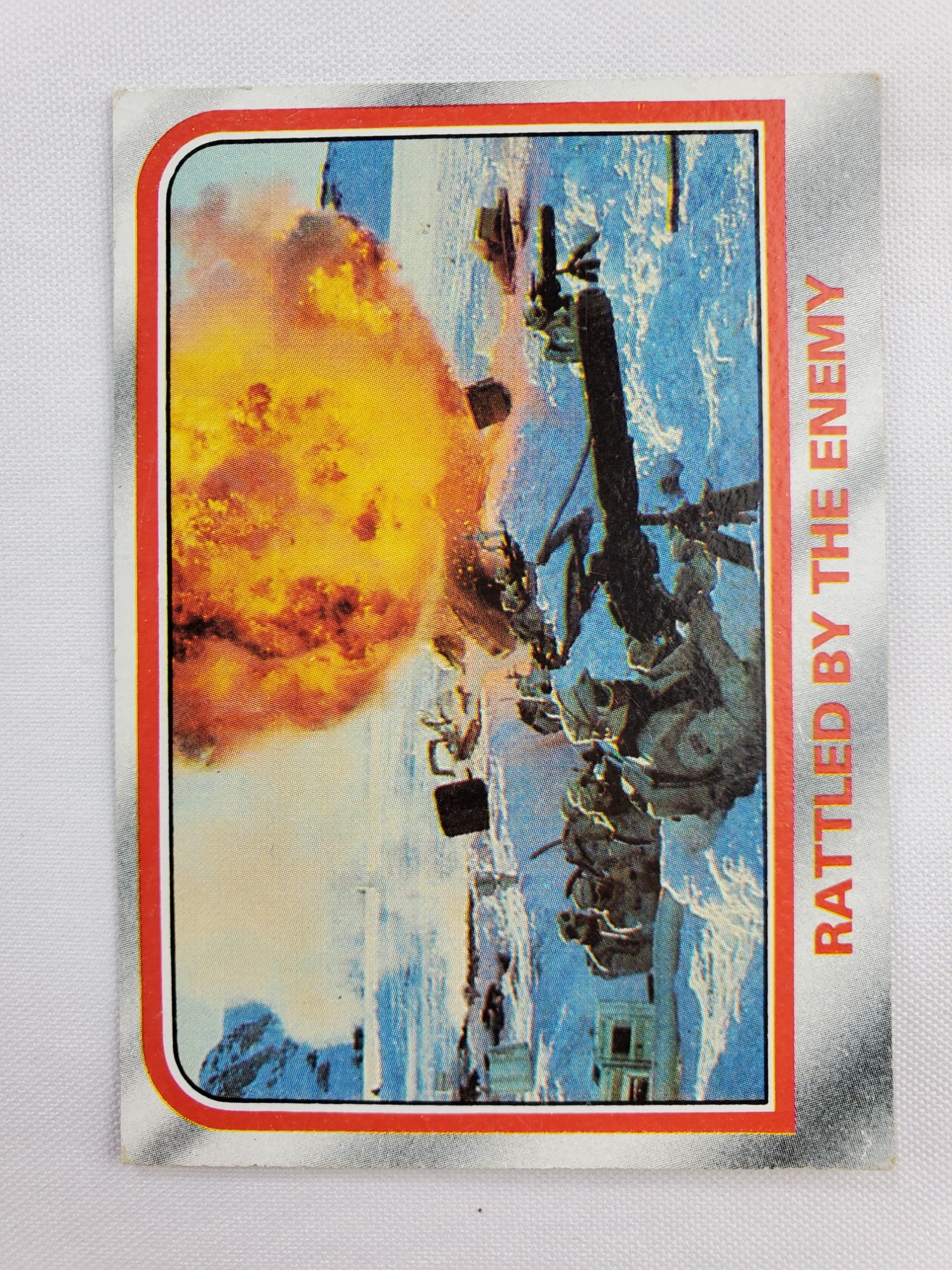 1980 Topps Star Wars: The Empire Strikes Back Series 1 Trading Card #41 – Rattled by the Enemy. The Empire Strikes Back Series 1 set is based on Star Wars: Episode V The Empire Strikes Back, and features stills from the film and promotional photos, all within a red and silver border. The first 10 cards are “Star File” character profile cards. The “Story Digest” themed cards tell the story of the movie on the back, and “Space Paintings” cards feature Ralph McQuarrie concept art on the front and “Movie Facts” on the back.