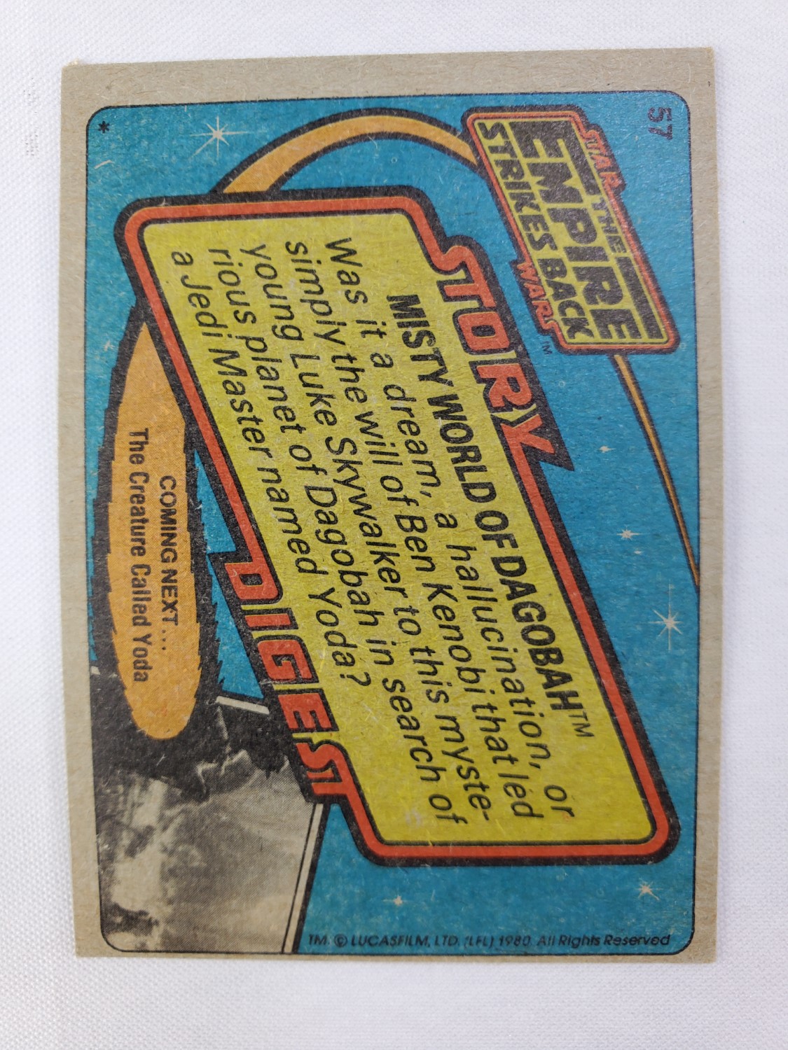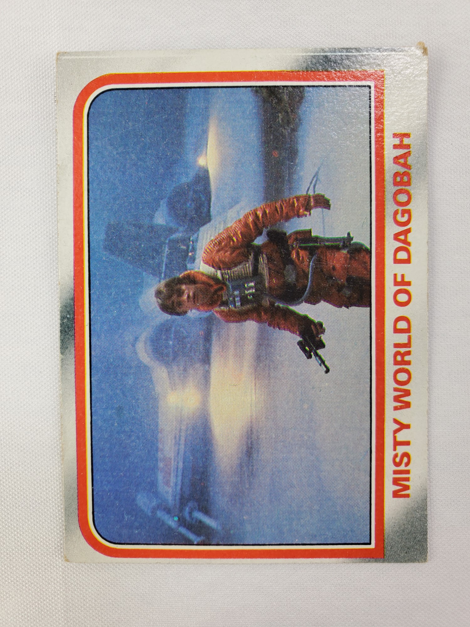 1980 Topps Star Wars: The Empire Strikes Back Series 1 Trading Card #57 – Misty World of Dagobah. The Empire Strikes Back Series 1 set is based on Star Wars: Episode V The Empire Strikes Back, and features stills from the film and promotional photos, all within a red and silver border. The first 10 cards are “Star File” character profile cards. The “Story Digest” themed cards tell the story of the movie on the back, and “Space Paintings” cards feature Ralph McQuarrie concept art on the front and “Movie Facts” on the back.