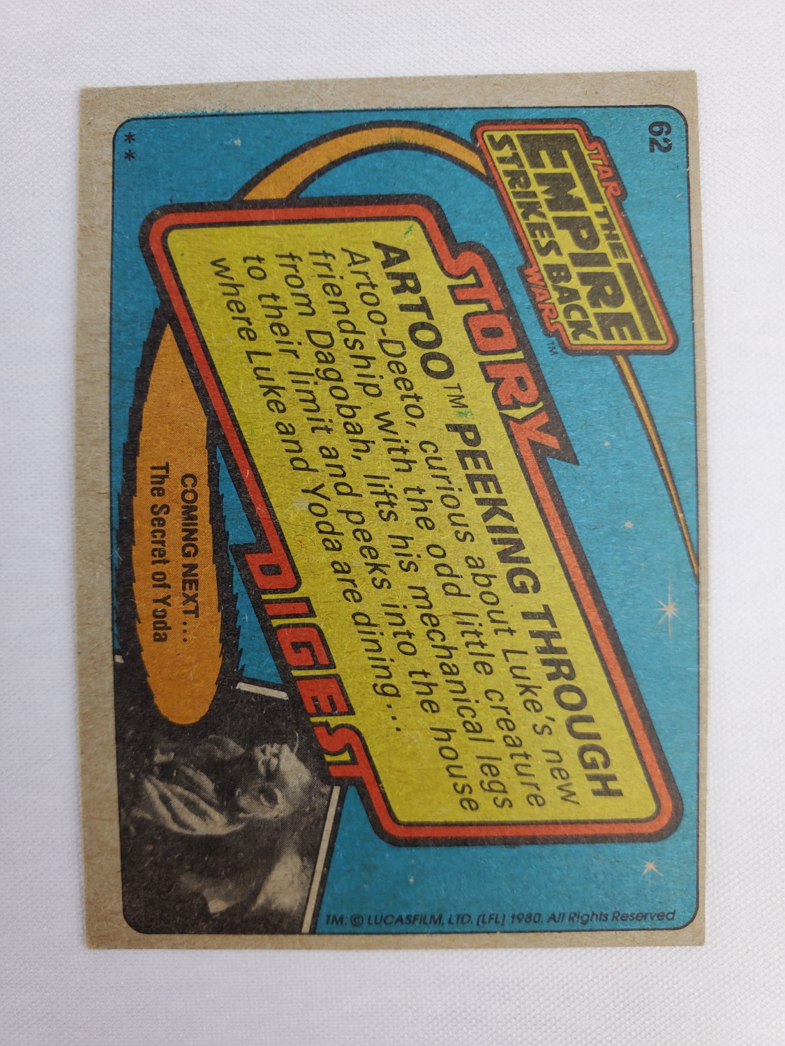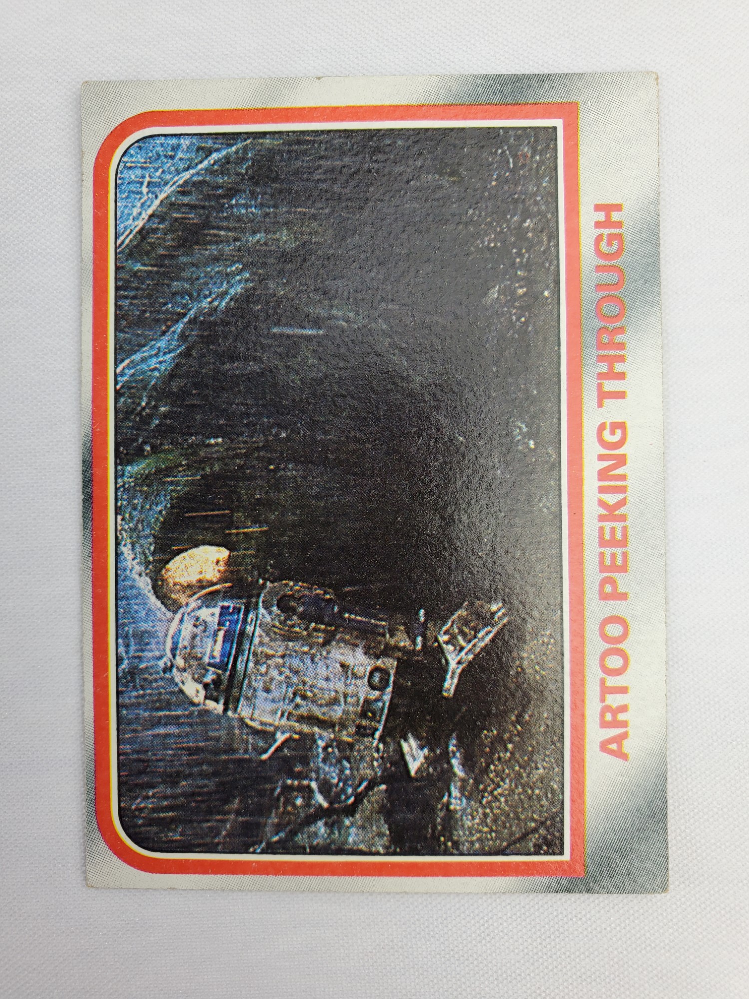 1980 Topps Star Wars: The Empire Strikes Back Series 1 Trading Card #62 – Artoo Peeking Through. The Empire Strikes Back Series 1 set is based on Star Wars: Episode V The Empire Strikes Back, and features stills from the film and promotional photos, all within a red and silver border. The first 10 cards are “Star File” character profile cards. The “Story Digest” themed cards tell the story of the movie on the back, and “Space Paintings” cards feature Ralph McQuarrie concept art on the front and “Movie Facts” on the back.