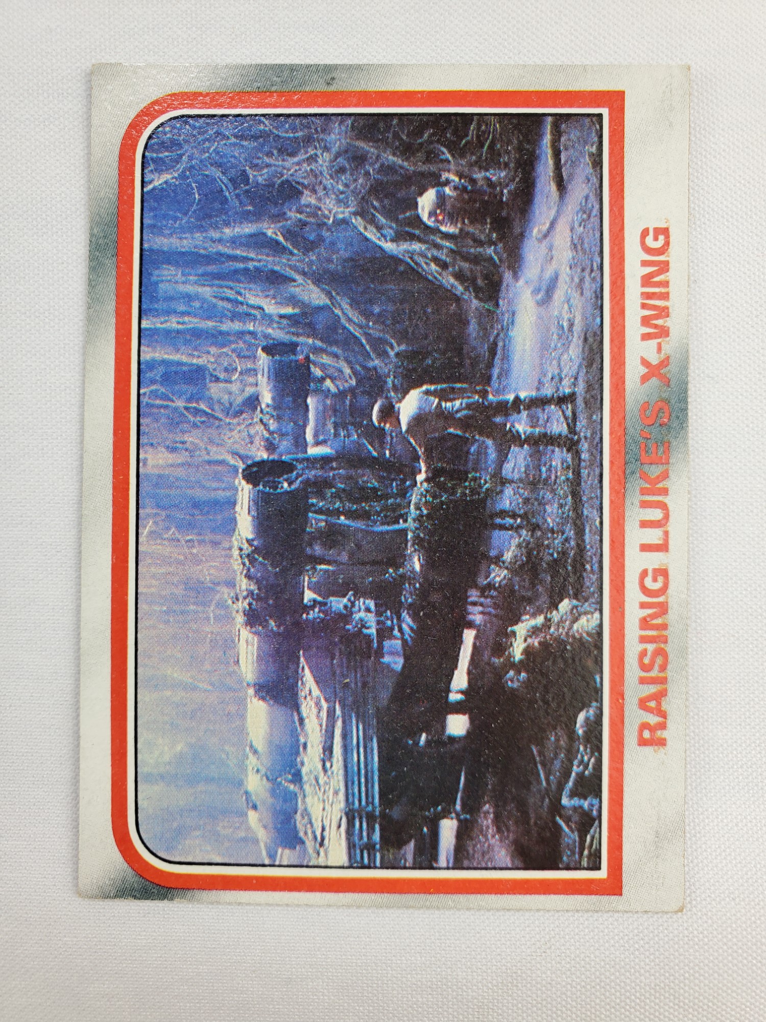 1980 Topps Star Wars: The Empire Strikes Back Series 1 Trading Card #71 – Raising Luke’s X-Wing. The Empire Strikes Back Series 1 set is based on Star Wars: Episode V The Empire Strikes Back, and features stills from the film and promotional photos, all within a red and silver border. The first 10 cards are “Star File” character profile cards. The “Story Digest” themed cards tell the story of the movie on the back, and “Space Paintings” cards feature Ralph McQuarrie concept art on the front and “Movie Facts” on the back.