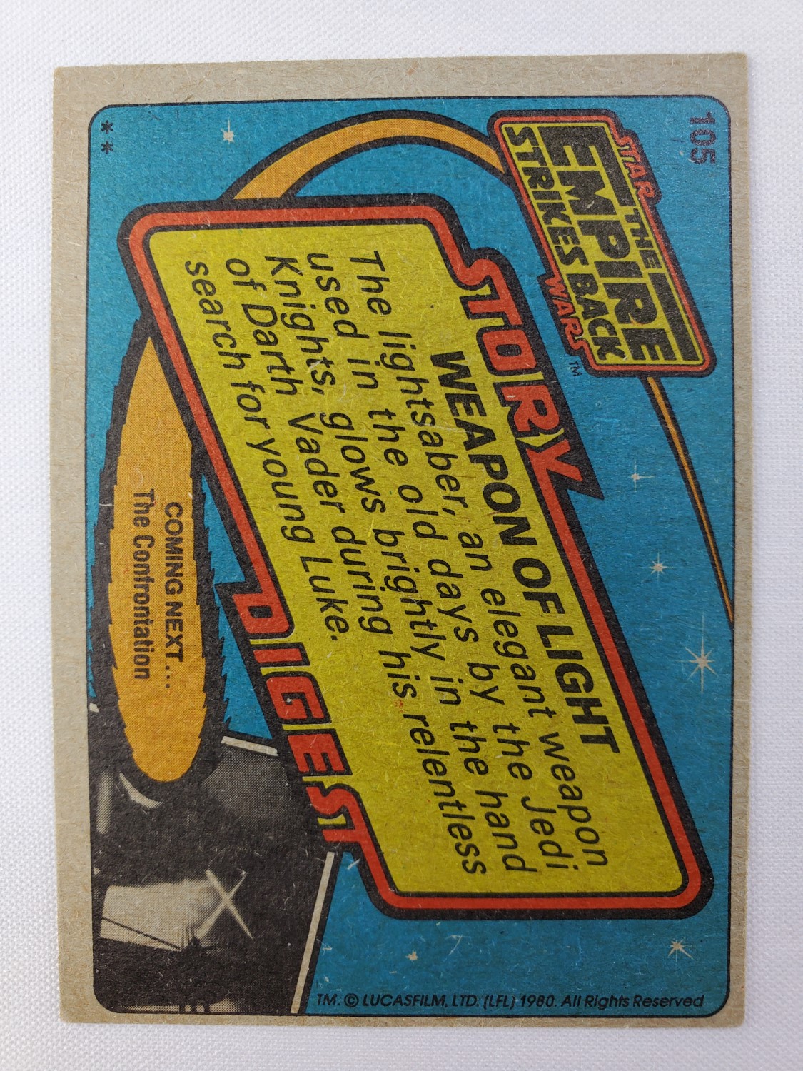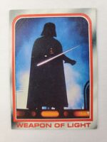 1980 Topps Star Wars: The Empire Strikes Back Series 1 Trading Card #105 – Weapon of Light. The Empire Strikes Back Series 1 set is based on Star Wars: Episode V The Empire Strikes Back, and features stills from the film and promotional photos, all within a red and silver border. The first 10 cards are “Star File” character profile cards. The “Story Digest” themed cards tell the story of the movie on the back, and “Space Paintings” cards feature Ralph McQuarrie concept art on the front and “Movie Facts” on the back.