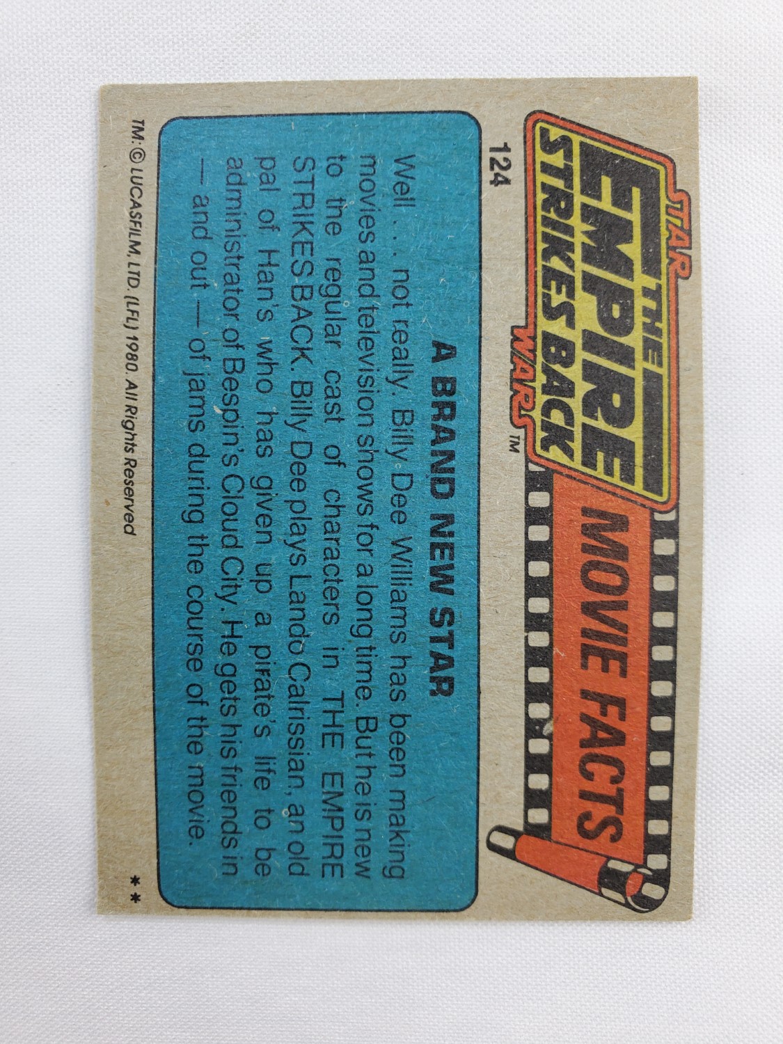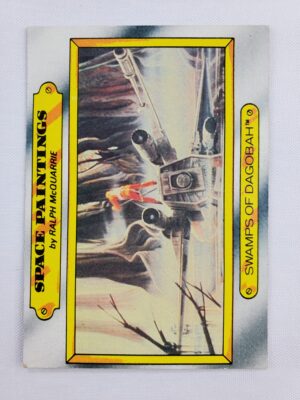 1980 Topps Star Wars: The Empire Strikes Back Series 1 Trading Card #124 – Cloud City. The Empire Strikes Back Series 1 set is based on Star Wars: Episode V The Empire Strikes Back, and features stills from the film and promotional photos, all within a red and silver border. The first 10 cards are “Star File” character profile cards. The “Story Digest” themed cards tell the story of the movie on the back, and “Space Paintings” cards feature Ralph McQuarrie concept art on the front and “Movie Facts” on the back.
