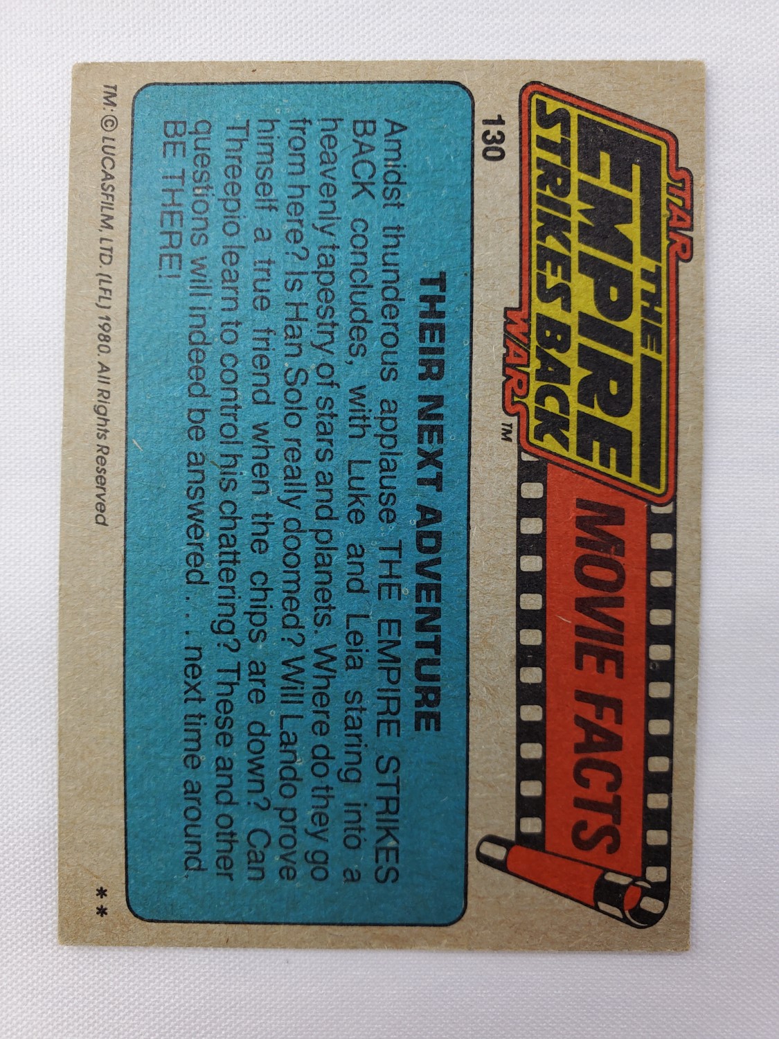 1980 Topps Star Wars: The Empire Strikes Back Series 1 Trading Card #130 – Ion Cannon. The Empire Strikes Back Series 1 set is based on Star Wars: Episode V The Empire Strikes Back, and features stills from the film and promotional photos, all within a red and silver border. The first 10 cards are “Star File” character profile cards. The “Story Digest” themed cards tell the story of the movie on the back, and “Space Paintings” cards feature Ralph McQuarrie concept art on the front and “Movie Facts” on the back.