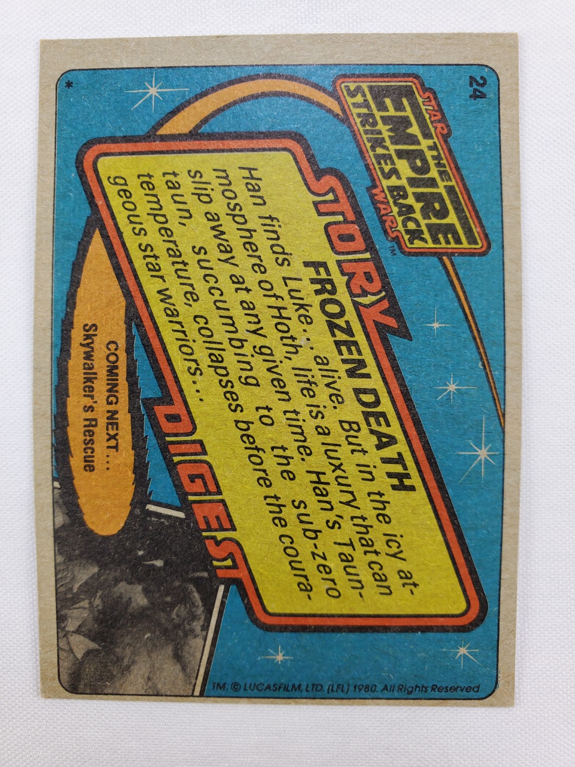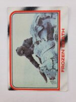 1980 Topps Star Wars: The Empire Strikes Back Series 1 Trading Card #24 – Frozen Death. The Empire Strikes Back Series 1 set is based on Star Wars: Episode V The Empire Strikes Back, and features stills from the film and promotional photos, all within a red and silver border. The first 10 cards are “Star File” character profile cards. The “Story Digest” themed cards tell the story of the movie on the back, and “Space Paintings” cards feature Ralph McQuarrie concept art on the front and “Movie Facts” on the back.