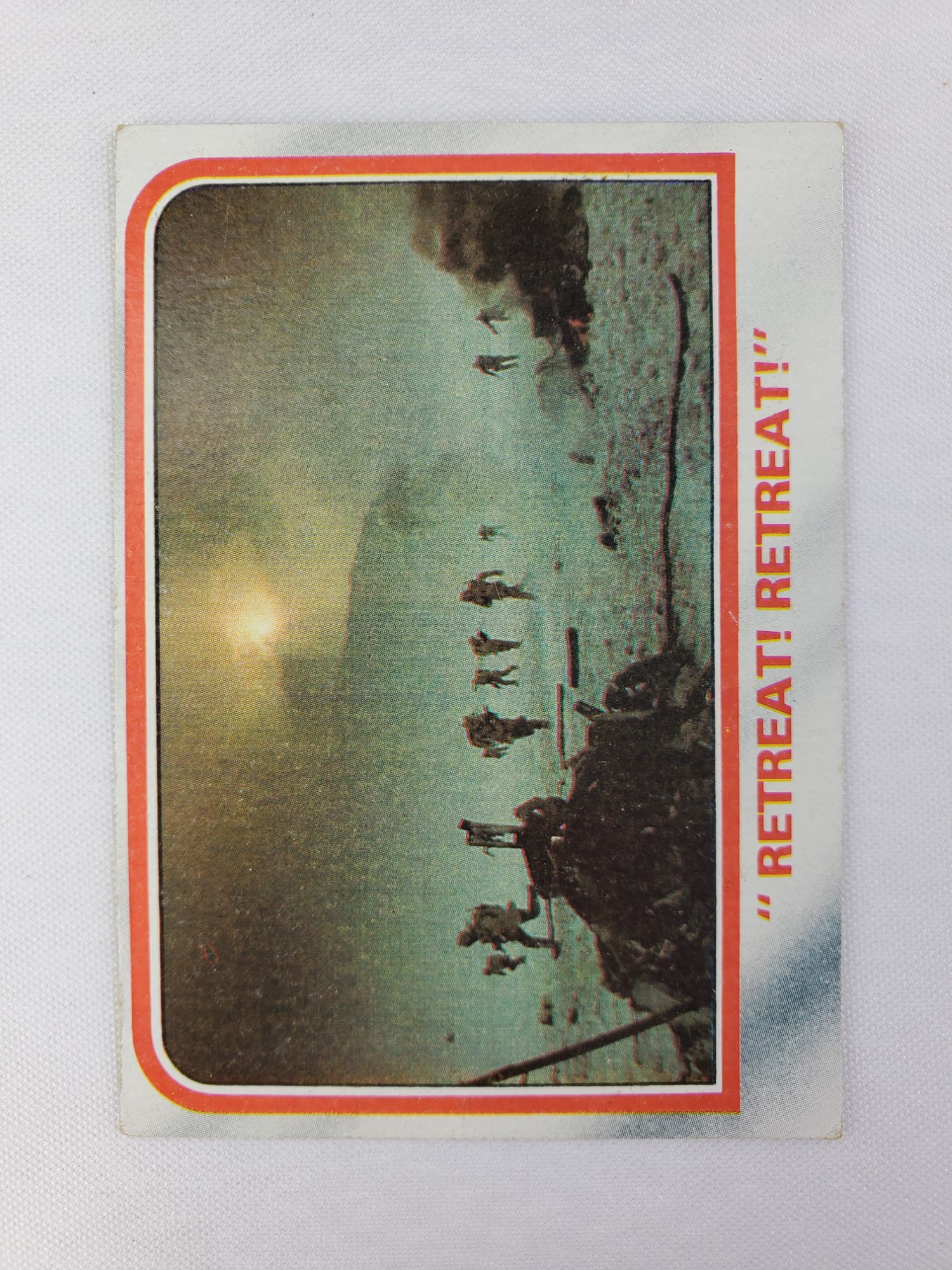 1980 Topps Star Wars: The Empire Strikes Back Series 1 Trading Card #46 – Retreat! Retreat! The Empire Strikes Back Series 1 set is based on Star Wars: Episode V The Empire Strikes Back, and features stills from the film and promotional photos, all within a red and silver border. The first 10 cards are “Star File” character profile cards. The “Story Digest” themed cards tell the story of the movie on the back, and “Space Paintings” cards feature Ralph McQuarrie concept art on the front and “Movie Facts” on the back.